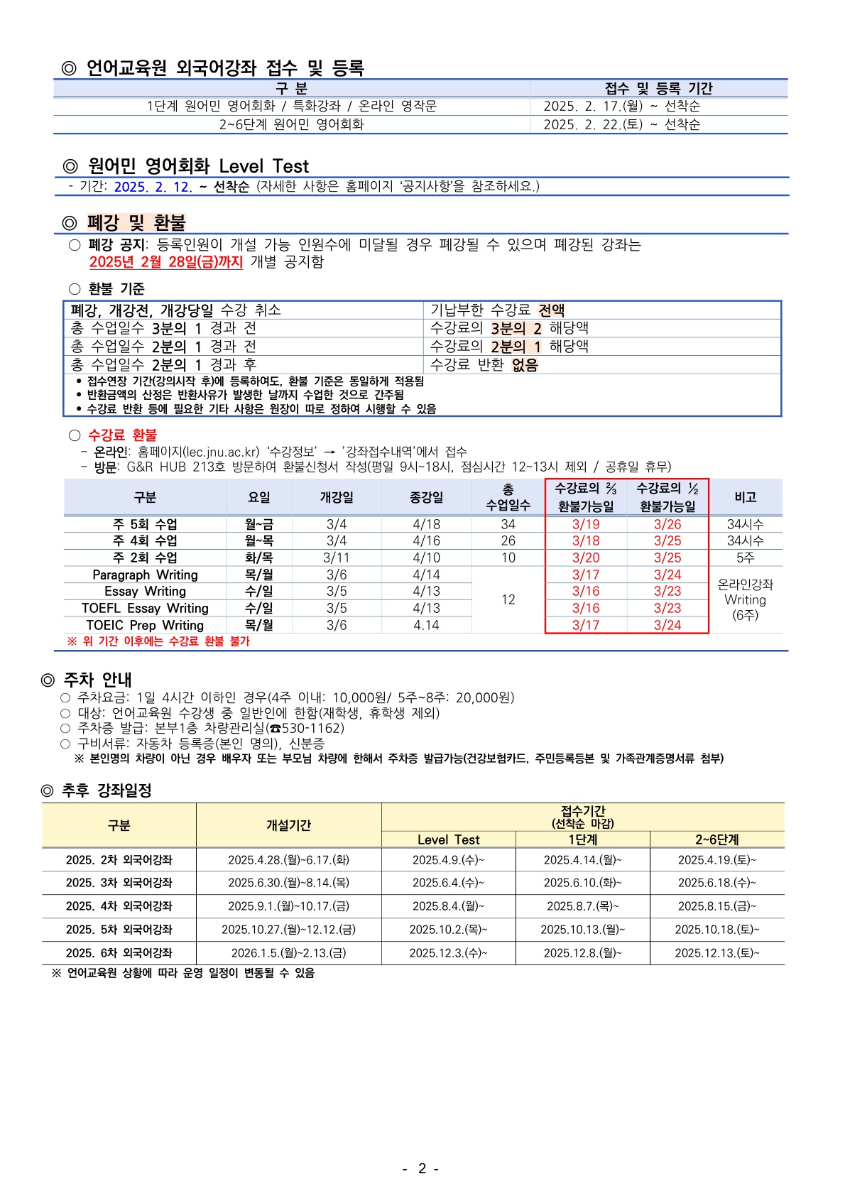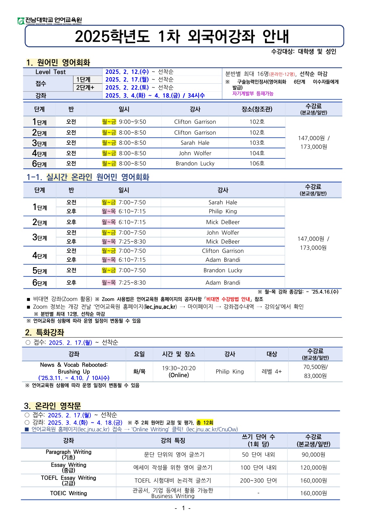 게시판 언어교육원 소개 외국어강좌 한국어강좌 특별강좌 강좌접수 게시판 영어학습센터 공지사항 공지사항 강좌소식 Q & A 특강제안하기 채용공지 영문교정 게시판 공유하기 복사 공지사항 2025학년도 1차 외국어강좌 안내 작성자 관리자2(lec) 작성일 2025-02-11 조회 3606 첨부파일 #1 2025 1차 외국어강좌안내(1).jpg[ 다운로드 : 389 ] 529KB첨부파일 #2 2025 1차 외국어강좌안내(2).jpg[ 다운로드 : 292 ] 499KB첨부파일 #3 2025 1차 외국어강좌안내.pdf[ 다운로드 : 367 ] 117KB ※ 영어회화 1단계(오전 9시), 2단계(오전 8시), 4단계(오전 7시) 분반은 담당 강사님(Clifton Garrison)의 비자 발급이 지연됨에 따라 첫 주 수업은 Rachel Griffith 강사님께서 대신 진행할 예정입니다. 수강생 여러분의 너른 양해를 부탁드리며, 원활한 강의 운영을 위해 최선을 다하겠습니다. [접수하러 가기] · 1단계: 2025. 2. 17.(월) ~ 선착순 · 2단계+: 2025. 2. 22.(토) ~ 선착순 *강좌: 2025. 3. 4.(화) ~ 4. 18.(금) 목록