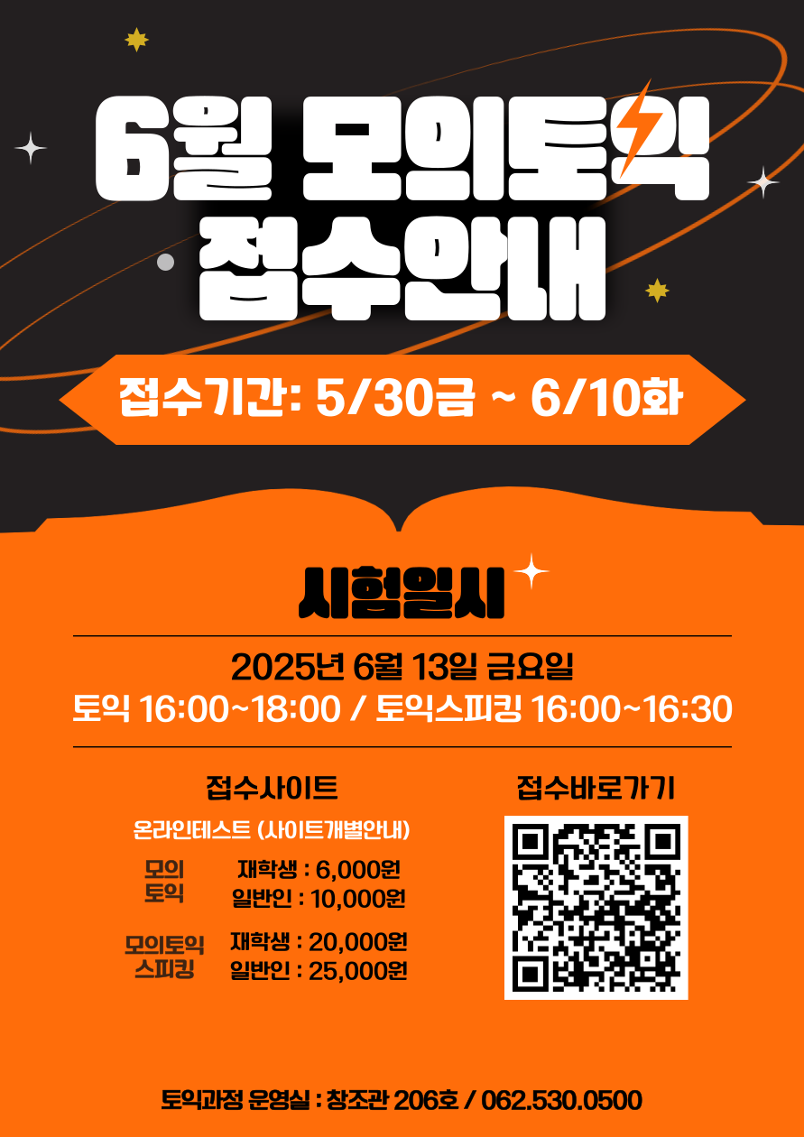 게시판 언어교육원 소개 외국어강좌 한국어강좌 특별강좌 강좌접수 게시판 영어학습센터 공지사항 공지사항 강좌소식 Q & A 특강제안하기 채용공지 영문교정 게시판 공유하기 복사 공지사항 2025년 6월 모의토익/모의 토익스피킹 접수 안내 작성자 관리자2(lec) 작성일 2025-06-02 조회 828 첨부파일 #1 25-전남대_광주_모의테스트_6월.png[ 다운로드 : 200 ] 168KB첨부파일 #2 [자료1] 2025년 전남대 모의테스트 공지.pdf[ 다운로드 : 176 ] 133KB - 시험일시 토익 - 6월 13일(금) 오후 4시 ~ 6시 토익스피킹 - 6월 13일(금) 오후 4시 ~ 4시30분 - 접수기간 : 5월 30일(금) ~ 6월 10일(화) - 시험형태 : 온라인(비대면) 시험 - 접수 방법 : 온라인접수 → 수강신청서, 하단 링크 참조 - 문의전화 : ☎ 062)530-0500 ※ 입금시 반드시 학생이름으로 입금바랍니다. 지금 바로 접수하기[클릭] 목록