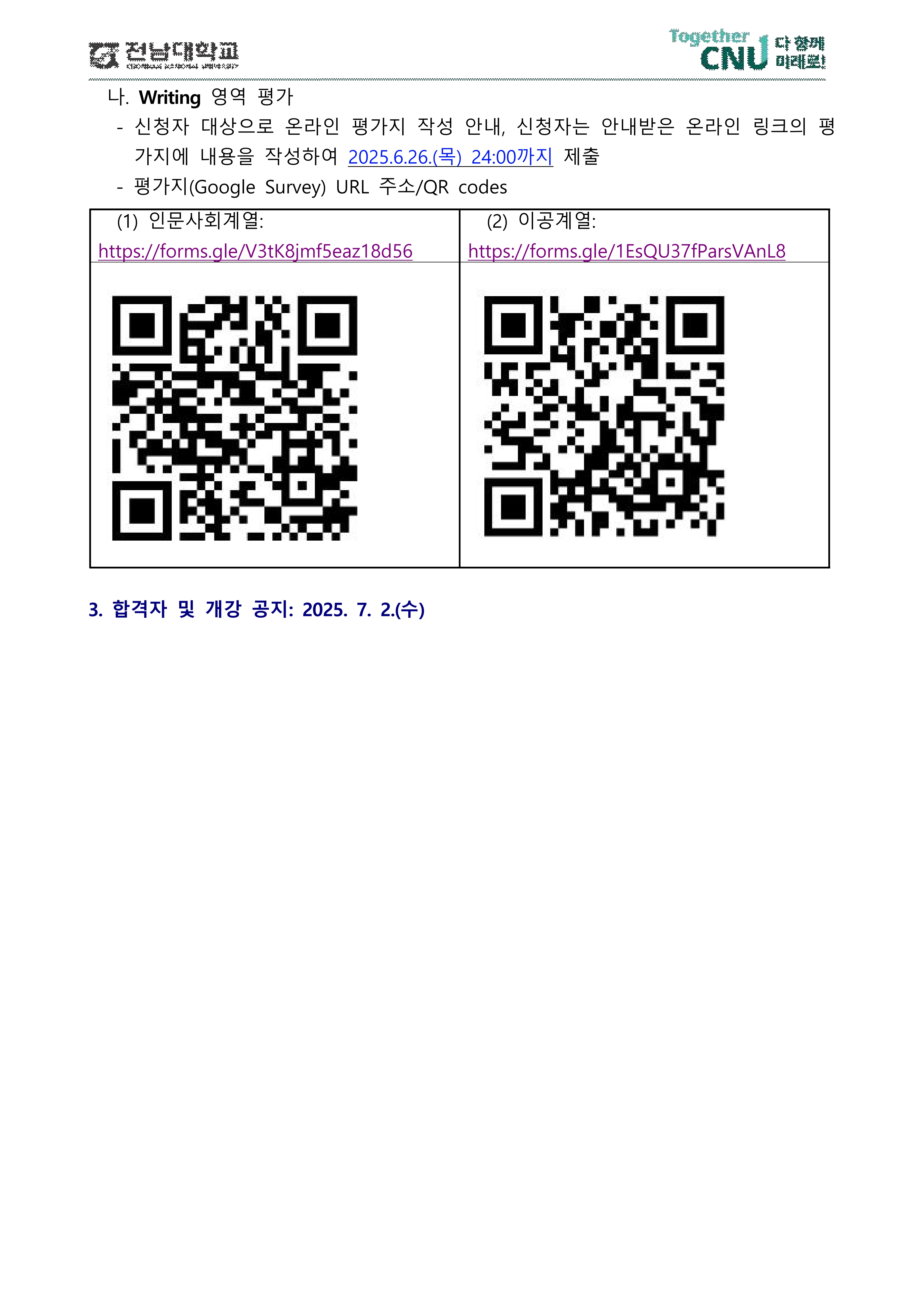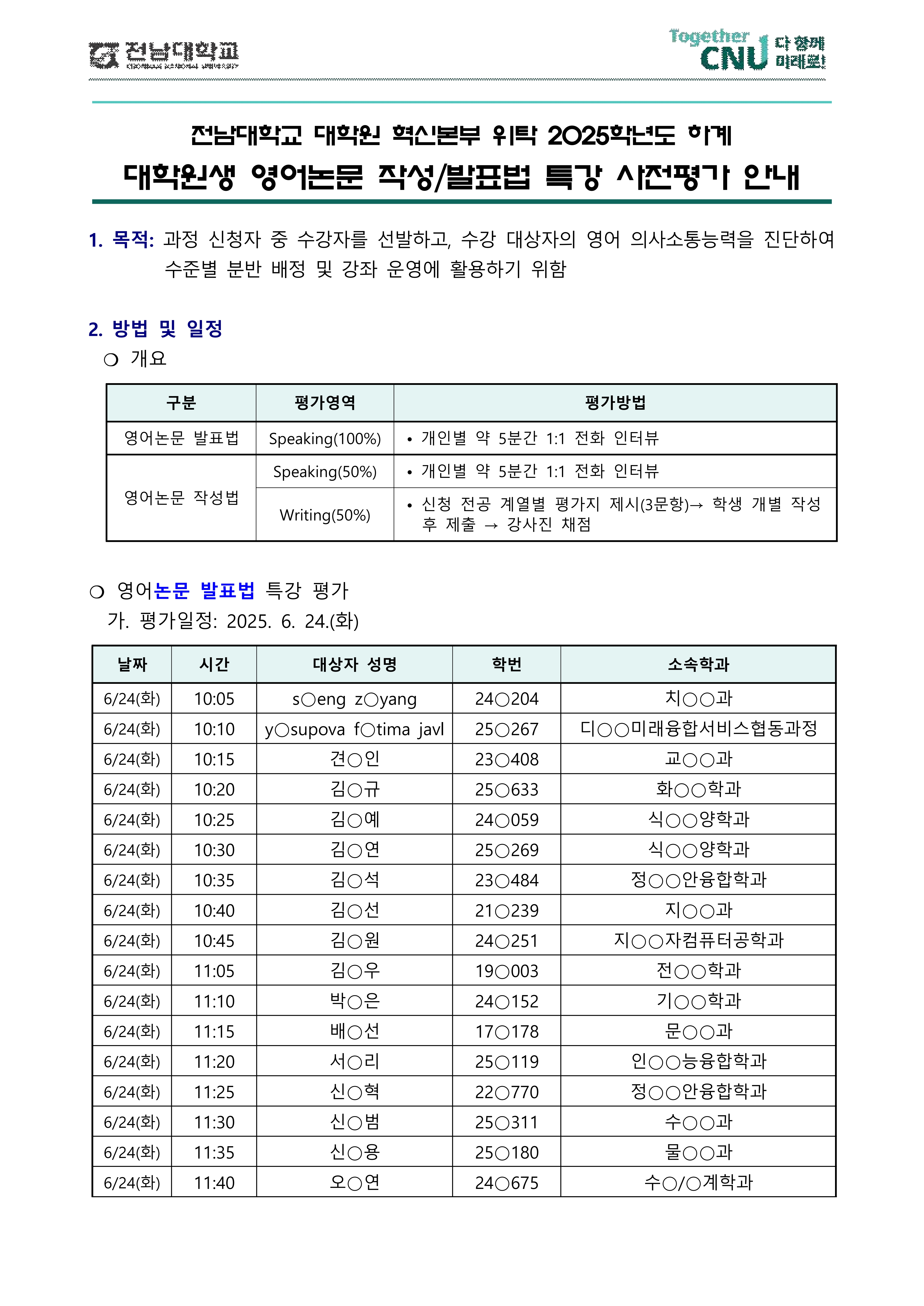 게시판 언어교육원 소개 외국어강좌 한국어강좌 특별강좌 강좌접수 게시판 영어학습센터 공지사항 공지사항 강좌소식 Q & A 특강제안하기 채용공지 영문교정 게시판 공유하기 복사 공지사항 2025학년도 하계 대학원생 영어논문 작성/발표법 특강 사전평가 안내 작성자 관리자2(lec) 작성일 2025-06-23 조회 692 첨부파일 #1 2025학년도 하계 대학원생 영어논문 특강 사전평가 안내문_1.jpg[ 다운로드 : 160 ] 2MB첨부파일 #2 2025학년도 하계 대학원생 영어논문 특강 사전평가 안내문_2.jpg[ 다운로드 : 111 ] 2MB첨부파일 #3 2025학년도 하계 대학원생 영어논문 특강 사전평가 안내문_3.jpg[ 다운로드 : 117 ] 3MB첨부파일 #4 2025학년도 하계 대학원생 영어논문 특강 사전평가 안내문_4.jpg[ 다운로드 : 109 ] 1MB첨부파일 #5 2025학년도 하계 대학원생 영어논문 특강 사전평가 안내문.pdf[ 다운로드 : 128 ] 154KB . 목록