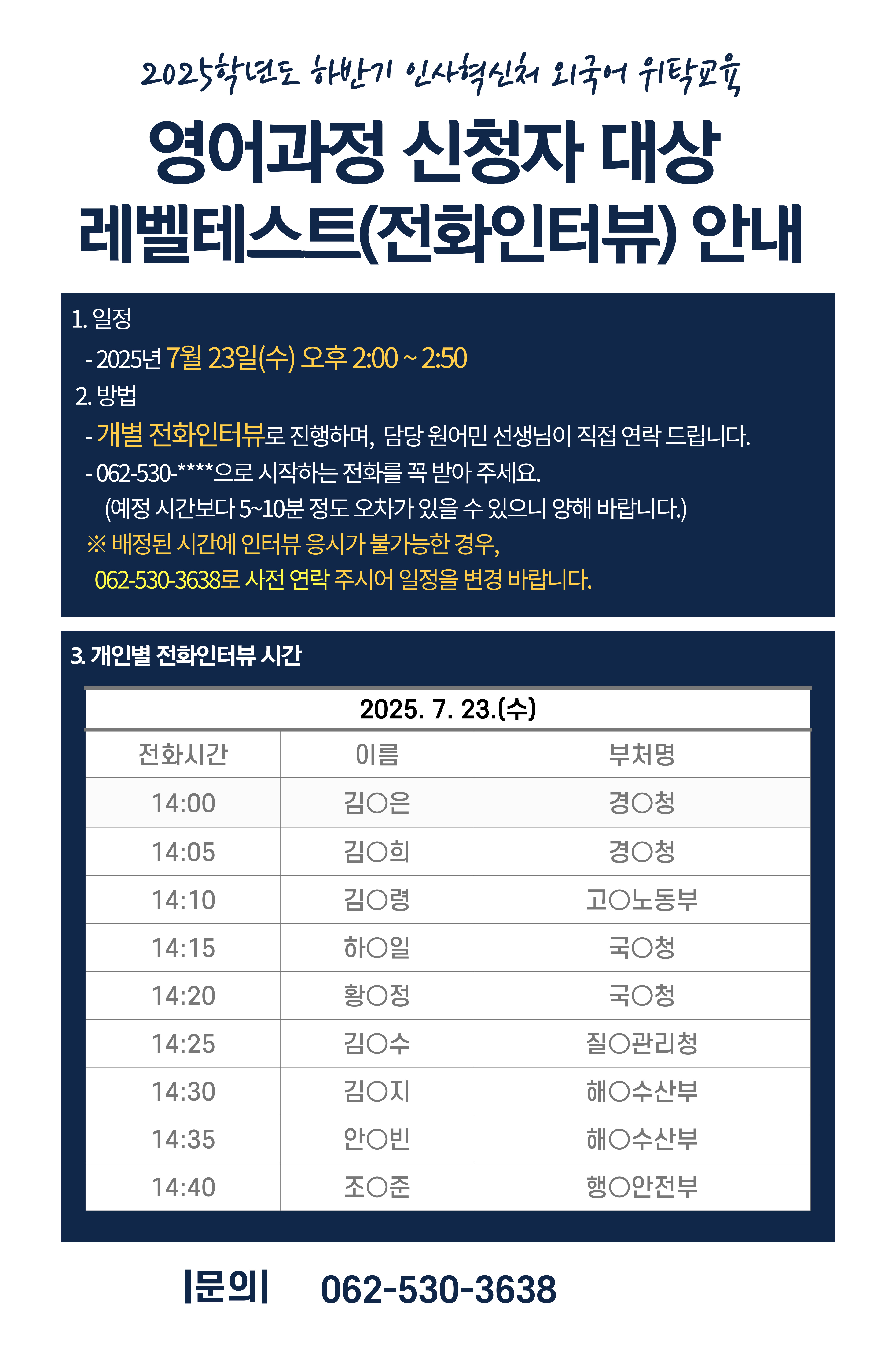 게시판 언어교육원 소개 외국어강좌 한국어강좌 특별강좌 강좌접수 게시판 영어학습센터 공지사항 공지사항 강좌소식 Q & A 특강제안하기 채용공지 영문교정 게시판 공유하기 복사 공지사항 2025년 하반기 인사혁신처 외국어 위탁교육_영어 과정 레벨테스트 안내 작성자 관리자2(lec) 작성일 2025-07-14 조회 402 첨부파일 #1 2025-하반기-인사혁신처-사전평가-001.jpg[ 다운로드 : 99 ] 1MB . 목록