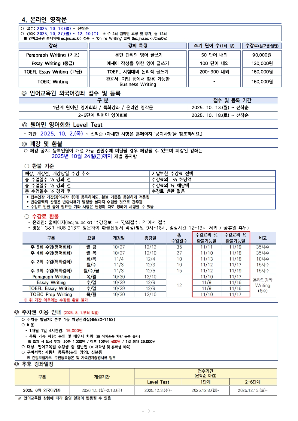 게시판 언어교육원 소개 외국어강좌 한국어강좌 특별강좌 강좌접수 게시판 영어학습센터 공지사항 공지사항 강좌소식 Q & A 특강제안하기 채용공지 영문교정 게시판 공유하기 복사 공지사항 2025학년도 5차 외국어강좌 안내 작성자 관리자2(lec) 작성일 2025-09-30 조회 1713 첨부파일 #1 image001.jpg[ 다운로드 : 72 ] 649KB첨부파일 #2 image002.jpg[ 다운로드 : 64 ] 748KB · 접수: [Level Test] / 외국어강좌] 목록