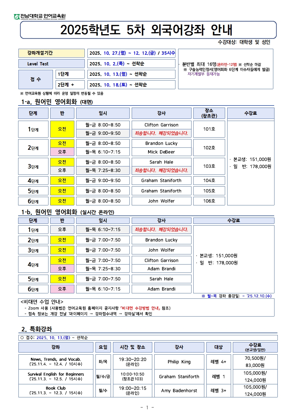 게시판 언어교육원 소개 외국어강좌 한국어강좌 특별강좌 강좌접수 게시판 영어학습센터 공지사항 공지사항 강좌소식 Q & A 특강제안하기 채용공지 영문교정 게시판 공유하기 복사 공지사항 2025학년도 5차 외국어강좌 개폐강 안내 작성자 관리자2(lec) 작성일 2025-10-24 조회 514 첨부파일 #1 개폐강001.jpg[ 다운로드 : 29 ] 662KB첨부파일 #2 개폐강002.jpg[ 다운로드 : 22 ] 748KB 목록