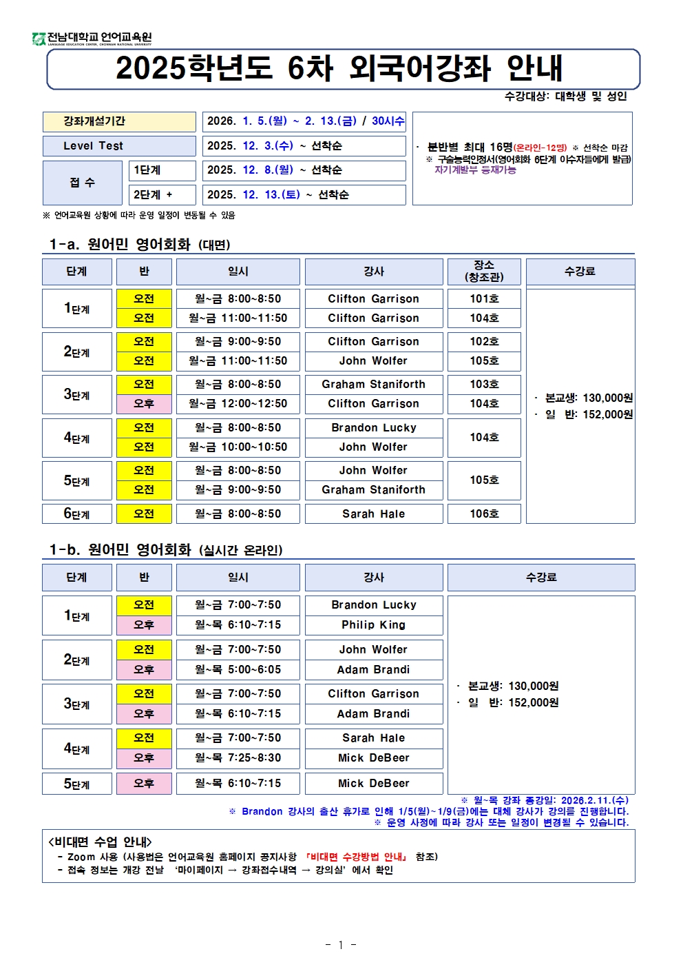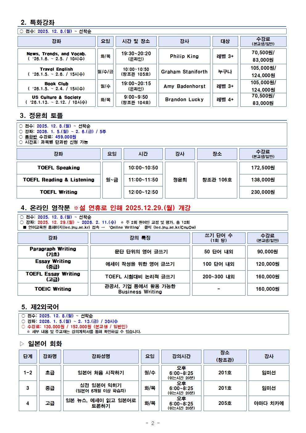 게시판 언어교육원 소개 외국어강좌 한국어강좌 특별강좌 강좌접수 게시판 영어학습센터 공지사항 공지사항 강좌소식 Q & A 특강제안하기 채용공지 영문교정 게시판 공유하기 복사 공지사항 2025학년도 6차 겨울방학 외국어강좌 안내 작성자 관리자2(lec) 작성일 2025-12-02 조회 972 첨부파일 #1 image001.jpg[ 다운로드 : 29 ] 702KB첨부파일 #2 image002.jpg[ 다운로드 : 24 ] 713KB첨부파일 #3 image003.jpg[ 다운로드 : 25 ] 741KB첨부파일 #4 image004.jpg[ 다운로드 : 15 ] 307KB · 접수: [Level Test] / 외국어강좌] 목록