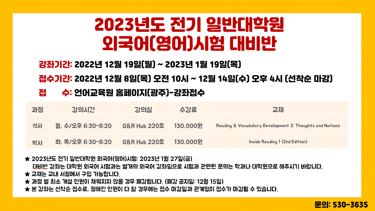 게시판 언어교육원 소개 외국어강좌 한국어강좌 특별강좌 강좌접수 게시판 영어학습센터 공지사항 공지사항 강좌소식 Q & A 특강제안하기 채용공지 영문교정 게시판 공유하기 복사 공지사항 2023년도 전기 일반대학원 외국어(영어)시험 대비반 모집 작성자 관리자2(lec) 작성일 2022-12-06 조회 1285 첨부파일 #1 대학원외국어시험대비반.GIF[ 다운로드 : 310 ] 109KB ★★★2023년도 전기 일반대학원 외국어(영어)시험과 관련된 문의는 소속학과 또는 대학원(062-530-5902)으로 해 주시기 바랍니다. 목록