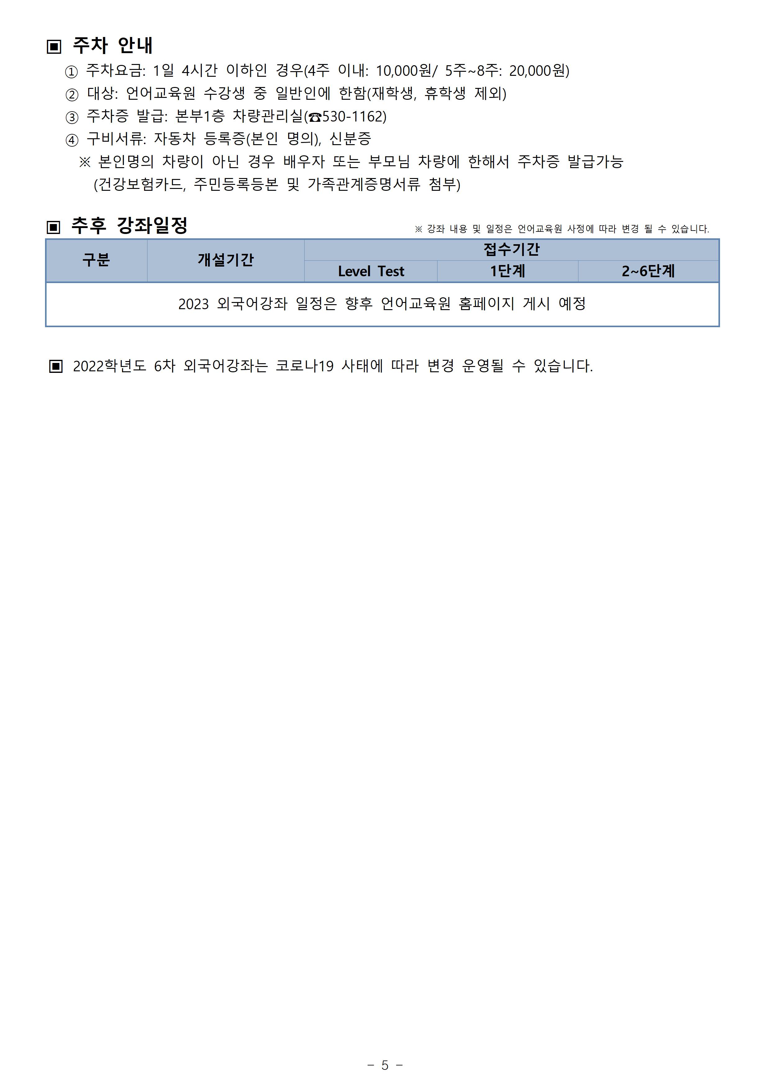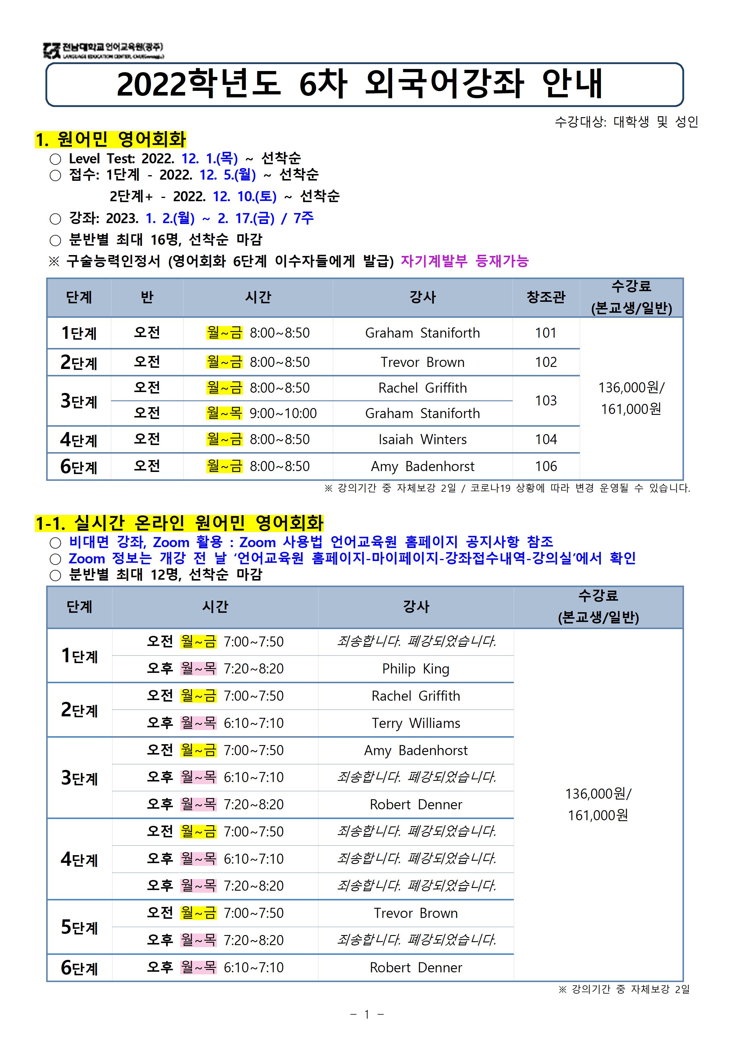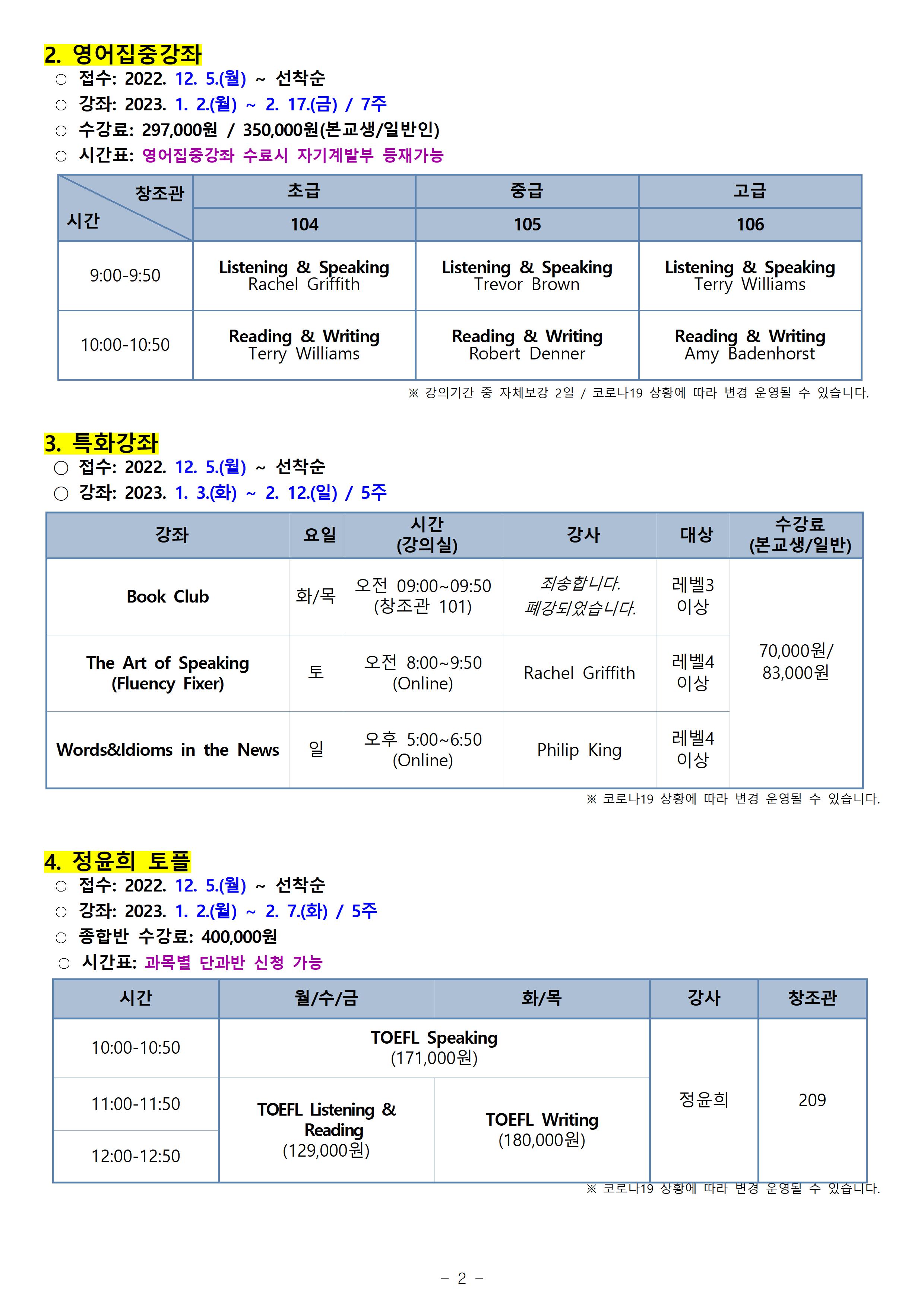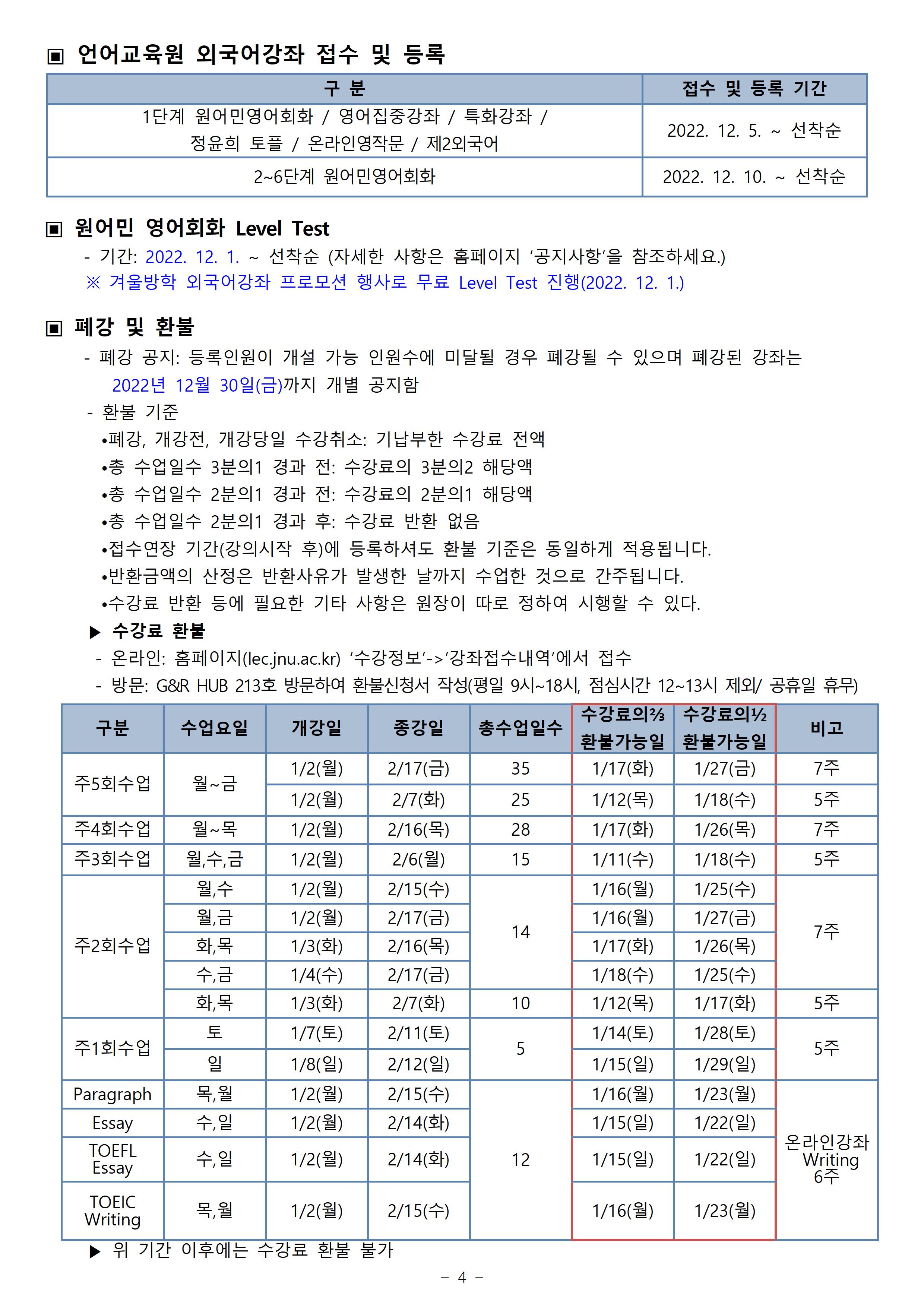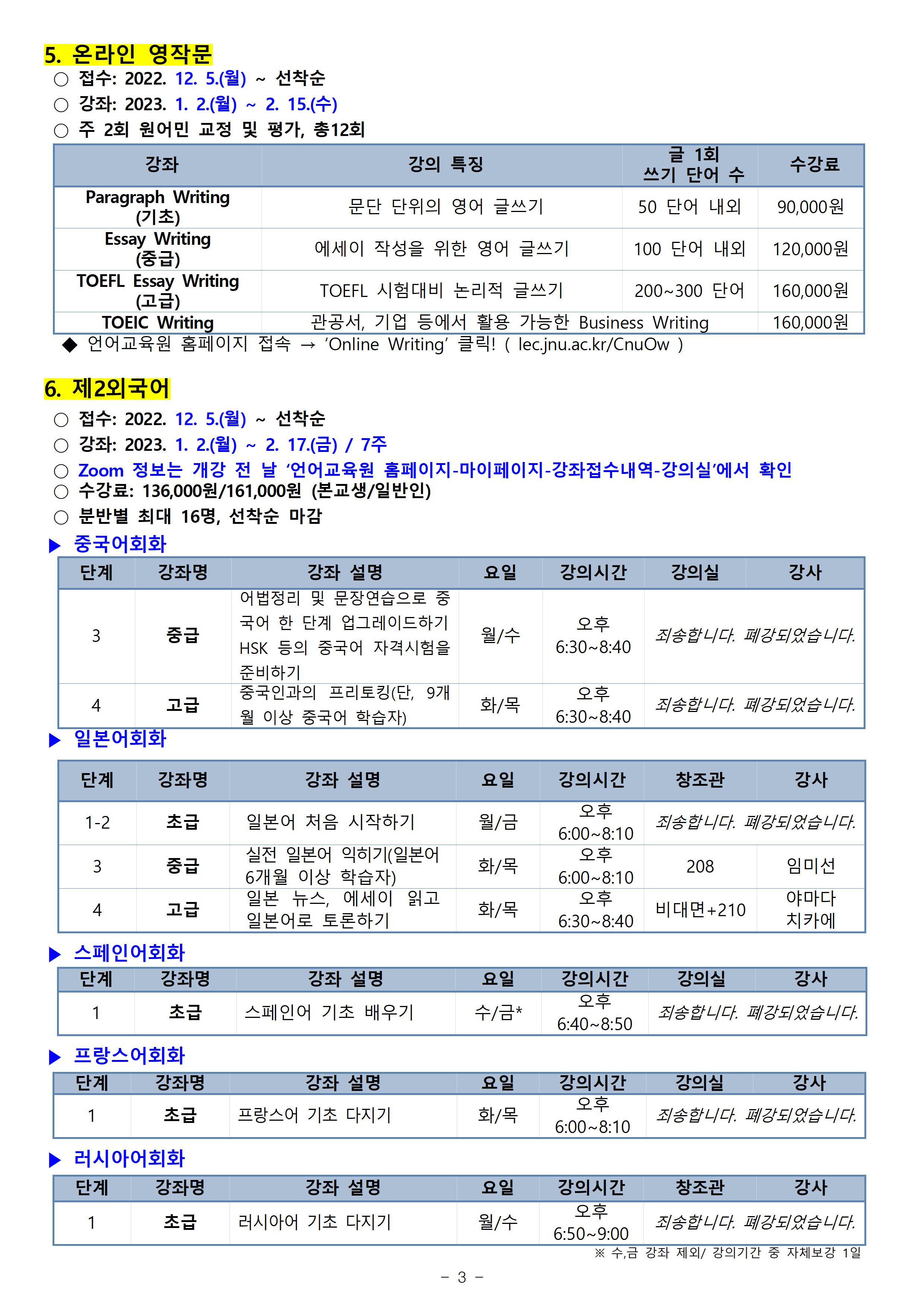 게시판 언어교육원 소개 외국어강좌 한국어강좌 특별강좌 강좌접수 게시판 영어학습센터 공지사항 공지사항 강좌소식 Q & A 특강제안하기 채용공지 영문교정 게시판 공유하기 복사 공지사항 2022학년도 겨울방학(6차) 외국어강좌 개폐강 안내 작성자 관리자2(lec) 작성일 2022-12-29 조회 2149 첨부파일 #1 image001.jpg[ 다운로드 : 304 ] 778KB첨부파일 #2 image002.jpg[ 다운로드 : 245 ] 615KB첨부파일 #3 image003.jpg[ 다운로드 : 226 ] 834KB첨부파일 #4 image004.jpg[ 다운로드 : 208 ] 872KB첨부파일 #5 image005.jpg[ 다운로드 : 198 ] 331KB (참고) 이미지 클릭시 좀 더 뚜렷하게 내용 확인 가능합니다. 목록
