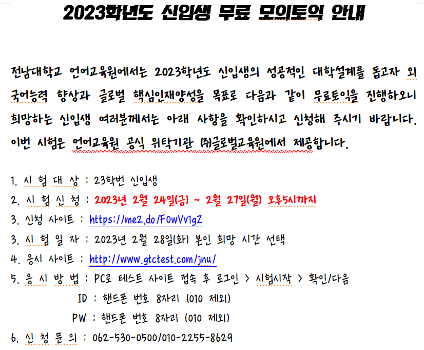게시판 언어교육원 소개 외국어강좌 한국어강좌 특별강좌 강좌접수 게시판 영어학습센터 공지사항 공지사항 강좌소식 Q & A 특강제안하기 채용공지 영문교정 게시판 공유하기 복사 공지사항 2023학년도 신입생 무료 모의토익 안내 작성자 관리자2(lec) 작성일 2023-02-24 조회 1994 첨부파일 #1 KakaoTalk_20230224_112951774.png[ 다운로드 : 212 ] 62KB 신청 사이트 : https://me2.do/F0wVv1gZ 응시 사이트 : http://www.gtctest.com/jnu/ 목록
