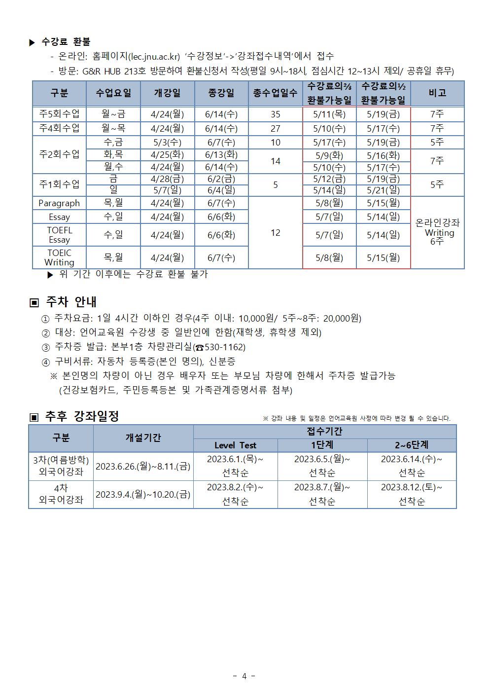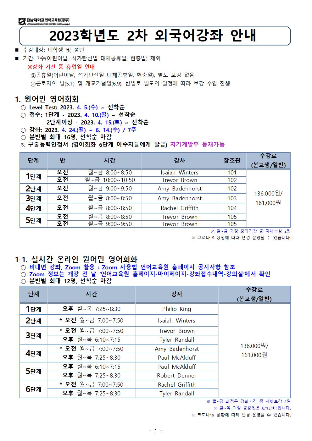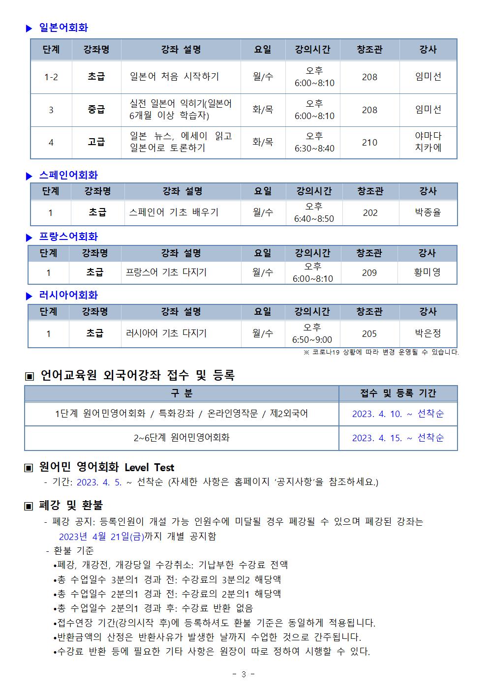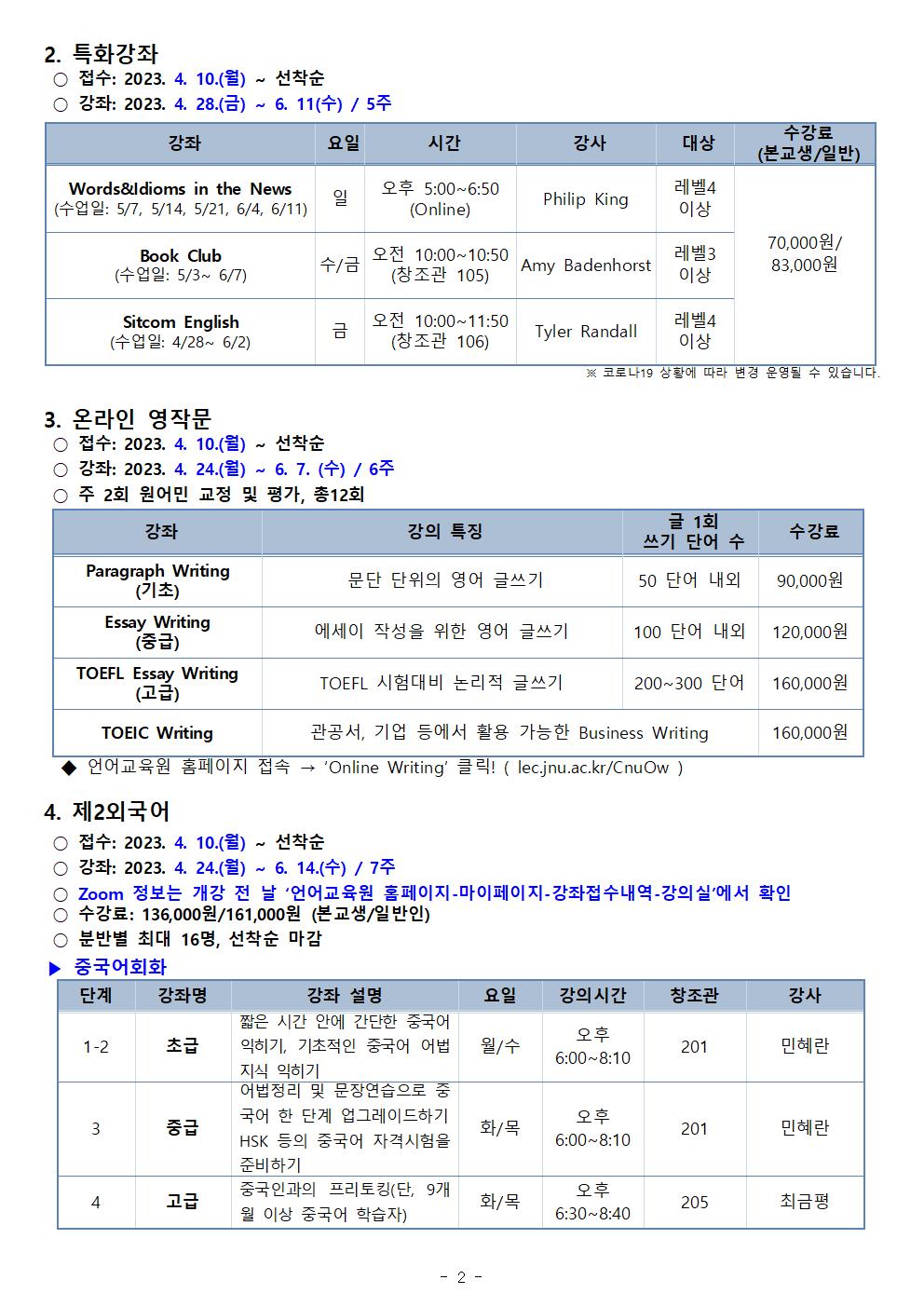 게시판 언어교육원 소개 외국어강좌 한국어강좌 특별강좌 강좌접수 게시판 영어학습센터 공지사항 공지사항 강좌소식 Q & A 특강제안하기 채용공지 영문교정 게시판 공유하기 복사 공지사항 2023학년도 봄학기(2차) 외국어강좌 안내 작성자 관리자2(lec) 작성일 2023-04-03 조회 2259 첨부파일 #1 2023 2차 외국어강좌안내(최종)001.jpg[ 다운로드 : 259 ] 221KB첨부파일 #2 2023 2차 외국어강좌안내(최종)002.jpg[ 다운로드 : 206 ] 198KB첨부파일 #3 2023 2차 외국어강좌안내(최종)003.jpg[ 다운로드 : 191 ] 195KB첨부파일 #4 2023 2차 외국어강좌안내(최종)004.jpg[ 다운로드 : 190 ] 192KB 감사합니다. 목록