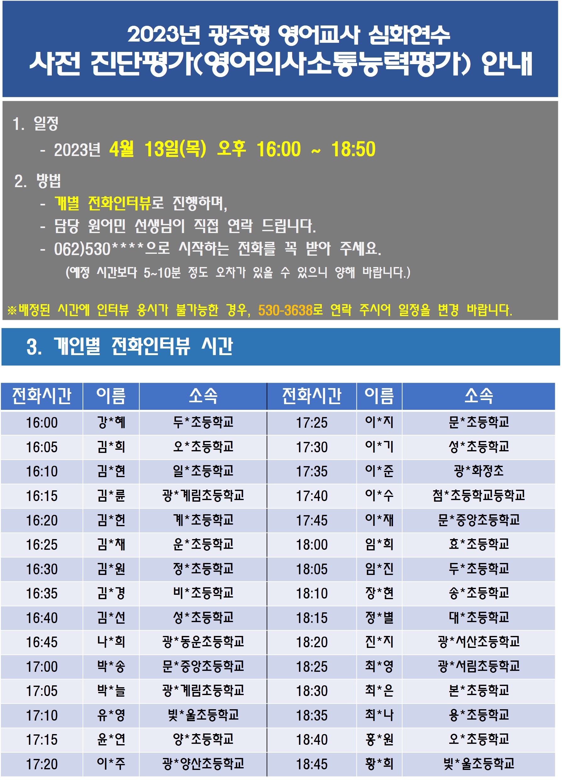 게시판 언어교육원 소개 외국어강좌 한국어강좌 특별강좌 강좌접수 게시판 영어학습센터 공지사항 공지사항 강좌소식 Q & A 특강제안하기 채용공지 영문교정 게시판 공유하기 복사 공지사항 2023년 광주형 영어교사 심화연수 사전 진단평가 안내 작성자 관리자2(lec) 작성일 2023-04-12 조회 1157 첨부파일 #1 진단평가 안내.jpg[ 다운로드 : 237 ] 676KB 배정된 시간에 인터뷰 응시가 어려운 분은 꼭 사전 연락(530-3638) 주시어 인터뷰 일정을 변경해주시기 바랍니다. 감사합니다. 목록