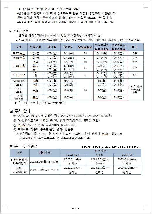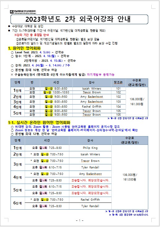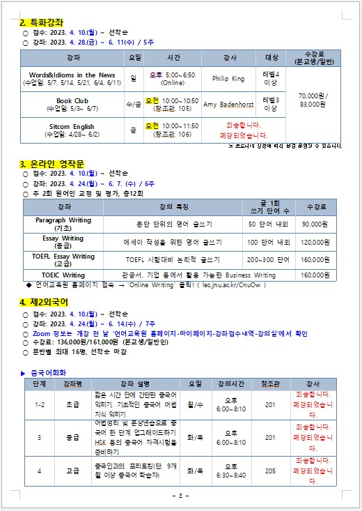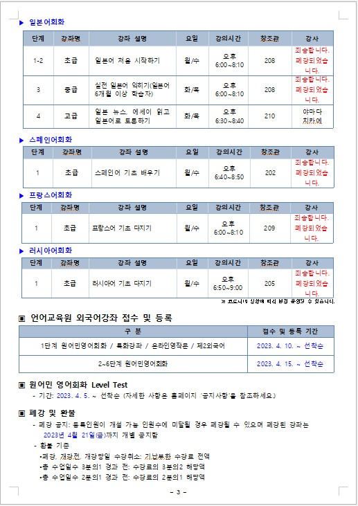 게시판 언어교육원 소개 외국어강좌 한국어강좌 특별강좌 강좌접수 게시판 영어학습센터 공지사항 공지사항 강좌소식 Q & A 특강제안하기 채용공지 영문교정 게시판 공유하기 복사 공지사항 2023학년도 2차 외국어강좌 개폐강 안내 작성자 관리자2(lec) 작성일 2023-04-20 조회 1664 첨부파일 #1 1.jpg[ 다운로드 : 271 ] 129KB첨부파일 #2 2.jpg[ 다운로드 : 207 ] 120KB첨부파일 #3 3.jpg[ 다운로드 : 222 ] 109KB첨부파일 #4 4.jpg[ 다운로드 : 248 ] 123KB 목록