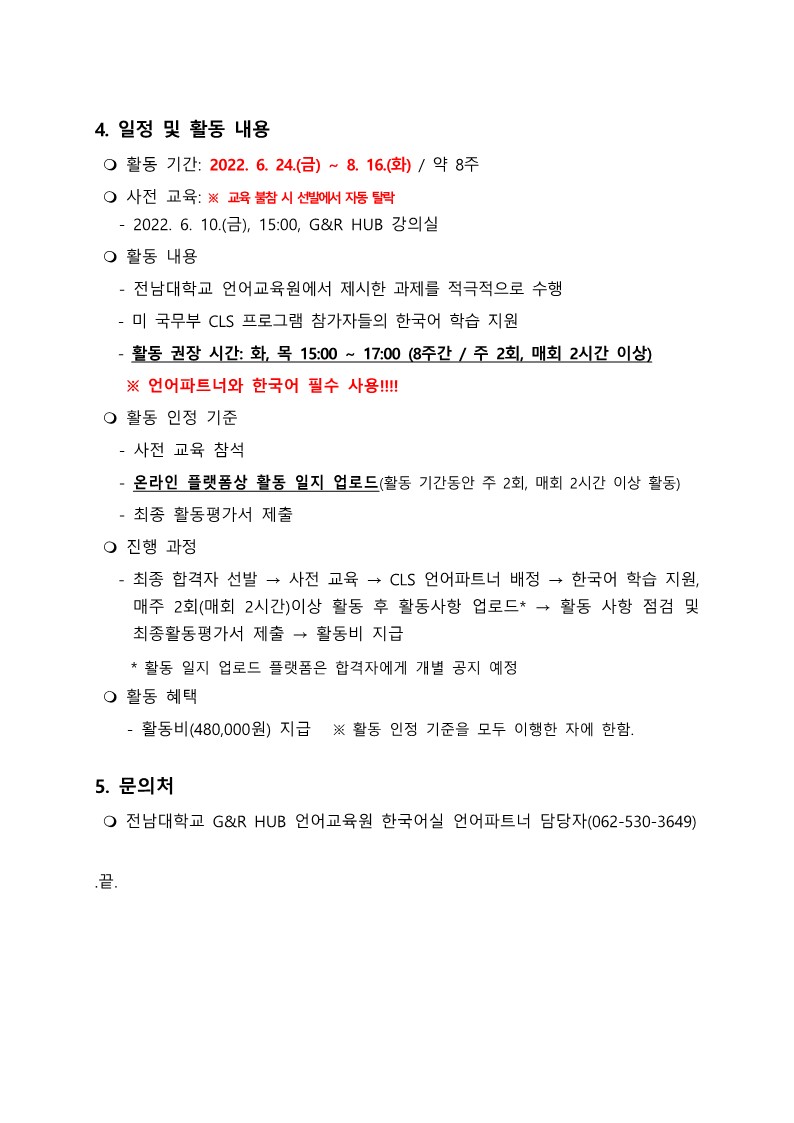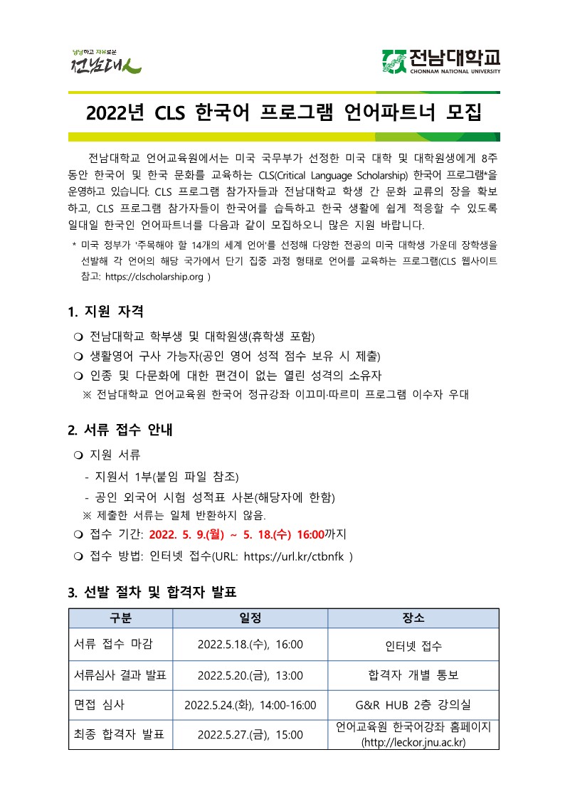 게시판 언어교육원 소개 외국어강좌 한국어강좌 특별강좌 강좌접수 게시판 영어학습센터 공지사항 공지사항 강좌소식 Q & A 특강제안하기 채용공지 영문교정 게시판 공유하기 복사 공지사항 2022 CLS 한국어 교육 프로그램 언어파트너 모집 작성자 관리자2(lec) 작성일 2022-05-10 조회 1724 첨부파일 #1 언어파트너 모집공고_22_1.jpg[ 다운로드 : 275 ] 171KB첨부파일 #2 언어파트너 모집공고_22_2.jpg[ 다운로드 : 273 ] 105KB (참고) 이미지 클릭시 좀 더 뚜렷하게 내용 확인 가능합니다. 온라인 지원 URL: https://url.kr/ctbnfk 목록