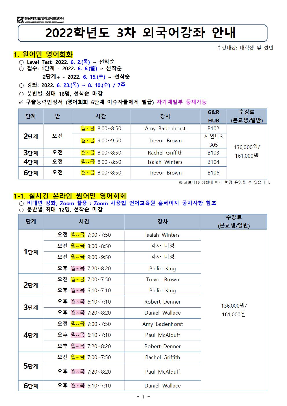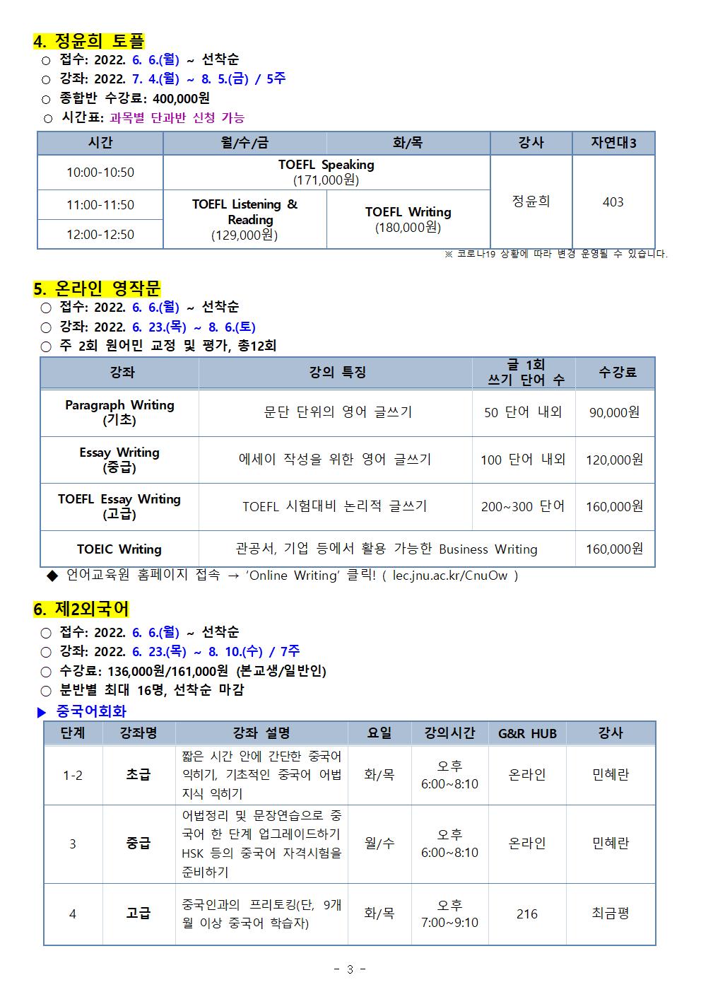 게시판 언어교육원 소개 외국어강좌 한국어강좌 특별강좌 강좌접수 게시판 영어학습센터 공지사항 공지사항 강좌소식 Q & A 특강제안하기 채용공지 영문교정 게시판 공유하기 복사 공지사항 2022학년도 여름방학(3차) 외국어강좌 안내 작성자 관리자2(lec) 작성일 2022-05-19 조회 3239 첨부파일 #1 image001.jpg[ 다운로드 : 273 ] 200KB첨부파일 #2 image002.jpg[ 다운로드 : 285 ] 189KB첨부파일 #3 image003.jpg[ 다운로드 : 241 ] 179KB첨부파일 #4 image004.jpg[ 다운로드 : 240 ] 207KB첨부파일 #5 image005.jpg[ 다운로드 : 264 ] 232KB (참고) 이미지 클릭시 좀 더 뚜렷하게 내용 확인 가능합니다. 목록