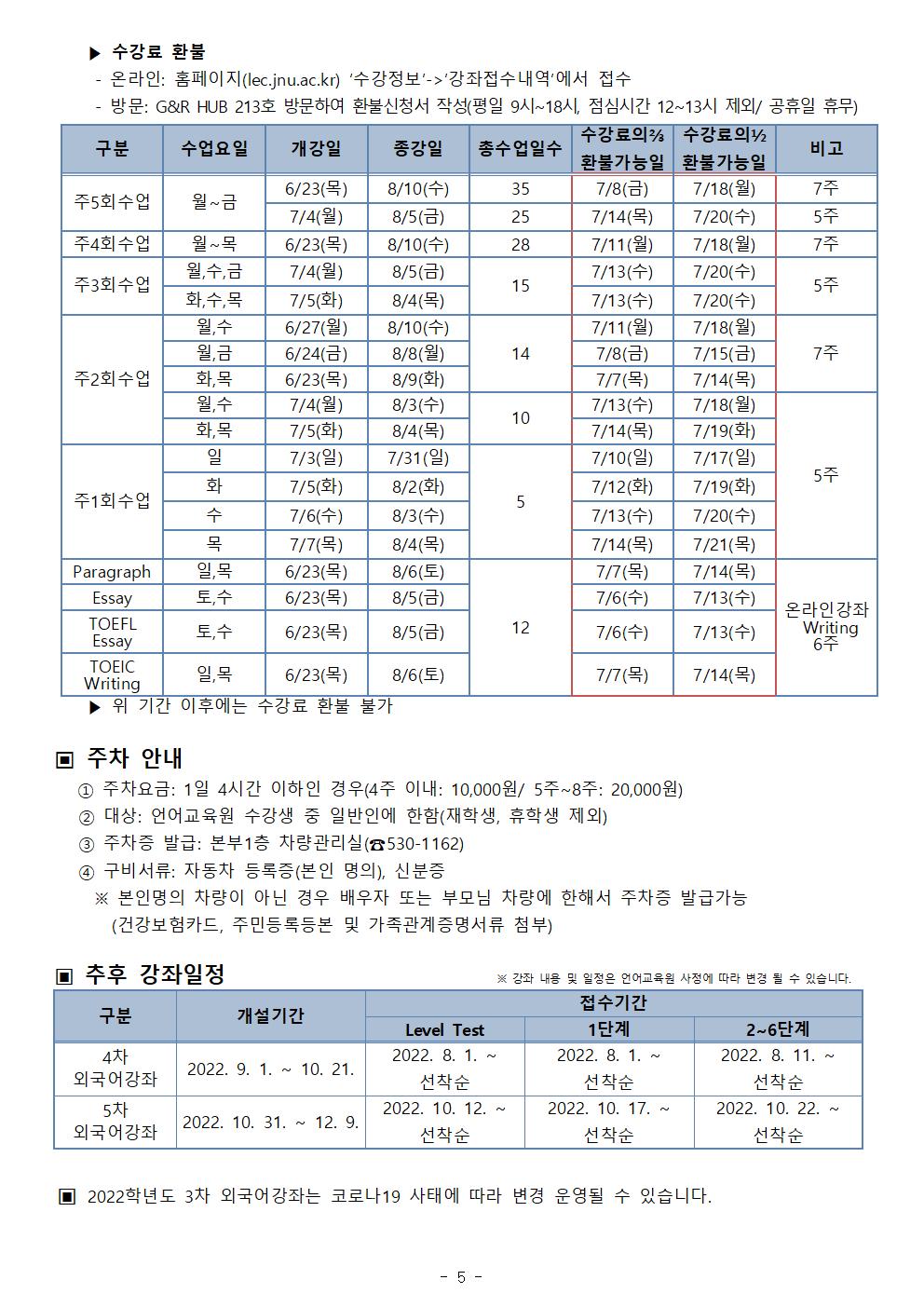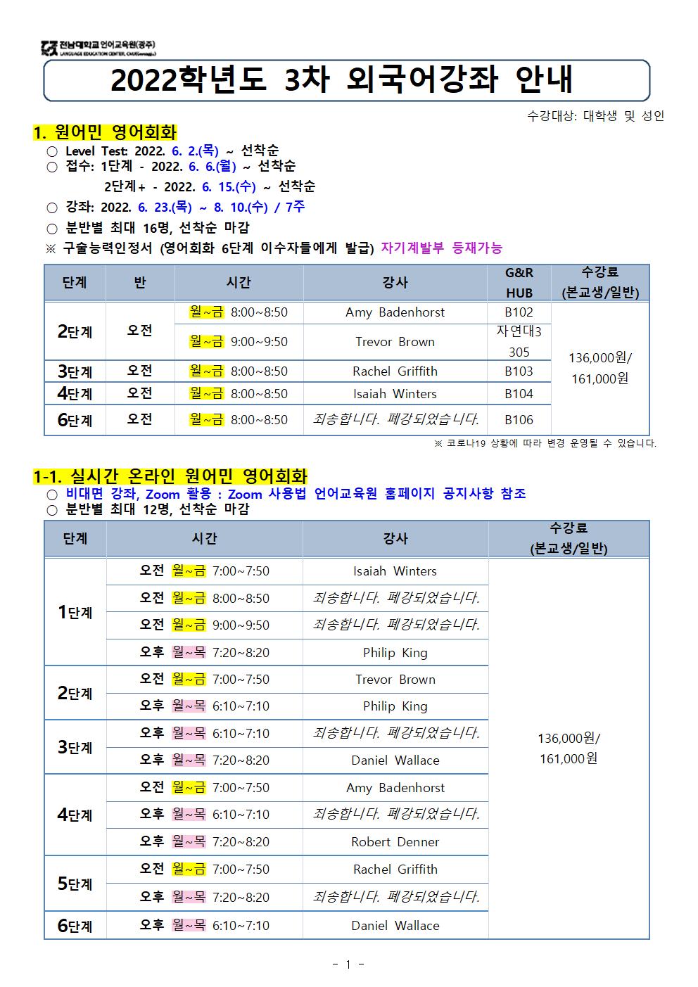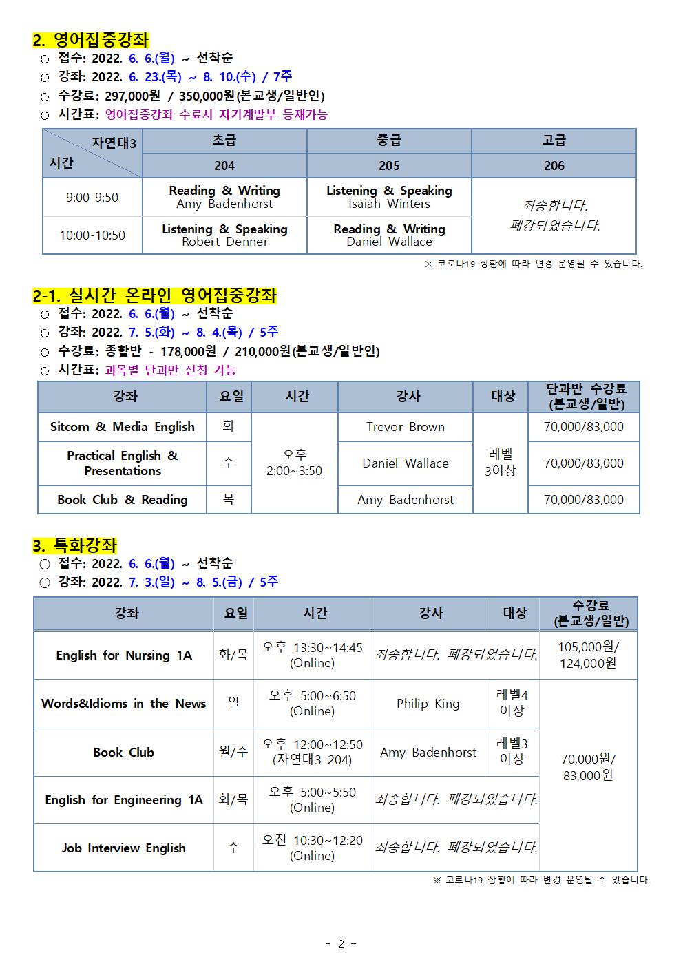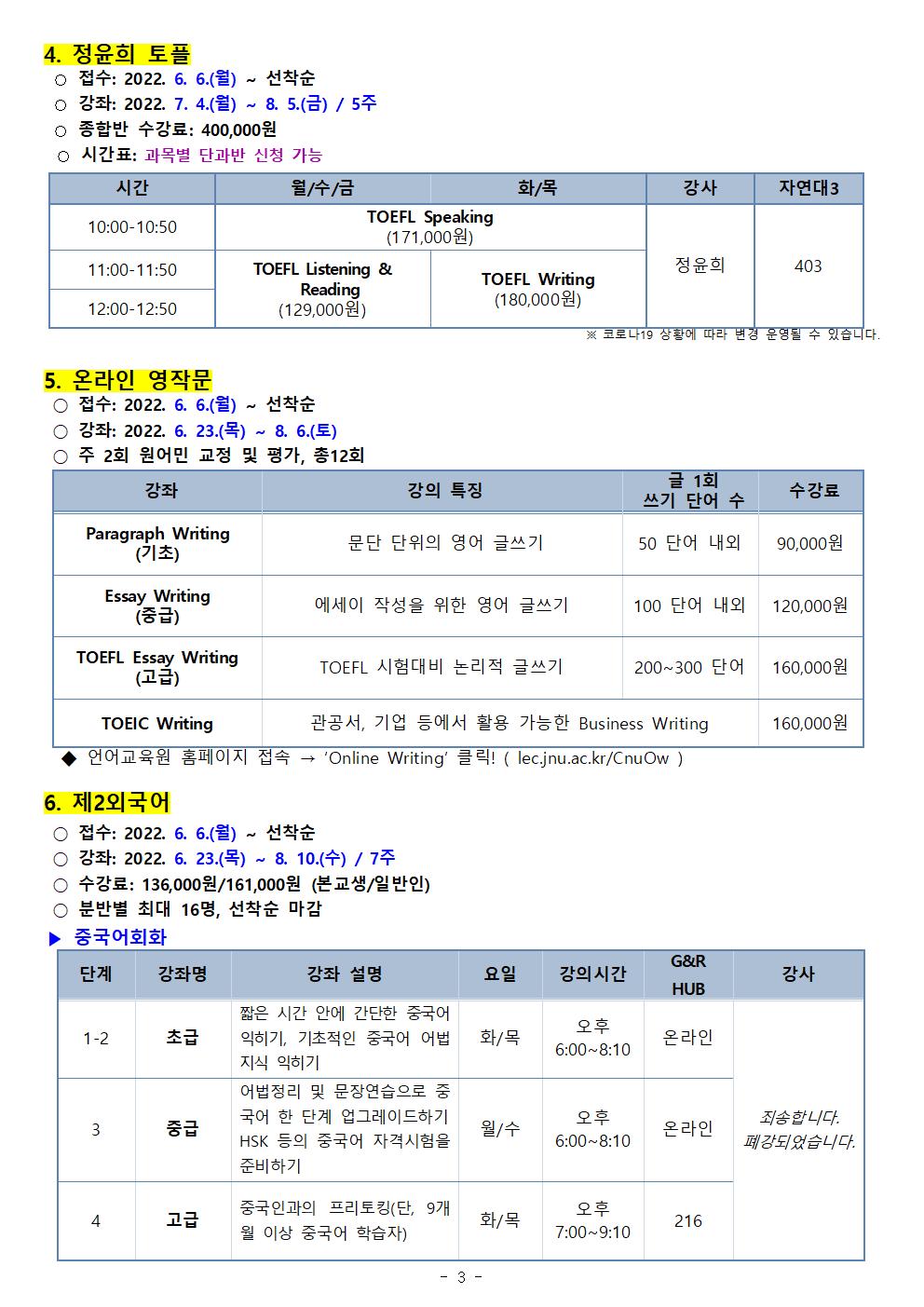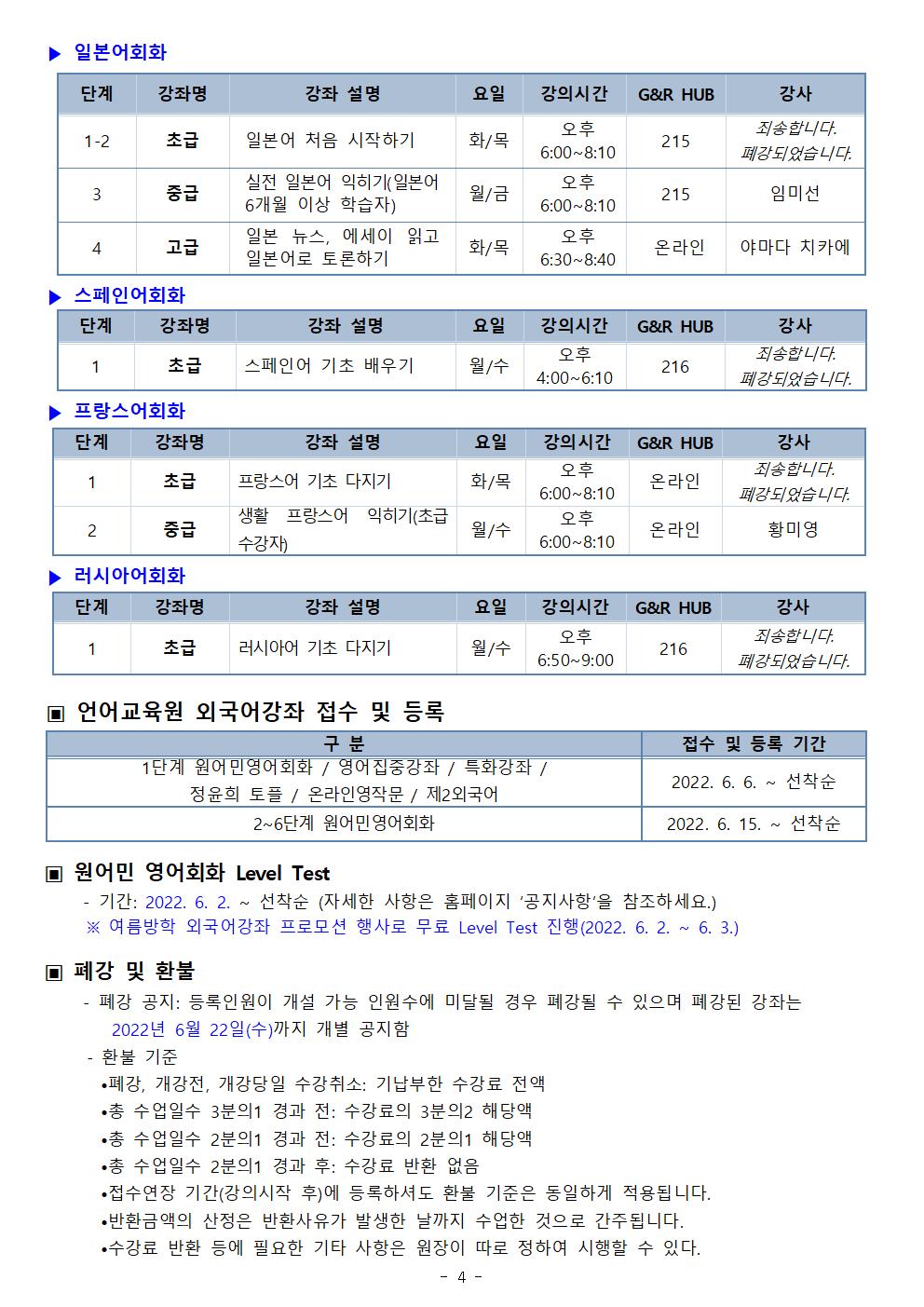 게시판 언어교육원 소개 외국어강좌 한국어강좌 특별강좌 강좌접수 게시판 영어학습센터 공지사항 공지사항 강좌소식 Q & A 특강제안하기 채용공지 영문교정 게시판 공유하기 복사 공지사항 2022학년도 여름방학(3차) 외국어강좌 개폐강 안내 작성자 관리자2(lec) 작성일 2022-06-21 조회 1917 첨부파일 #1 image001.jpg[ 다운로드 : 324 ] 209KB첨부파일 #2 image002.jpg[ 다운로드 : 307 ] 188KB첨부파일 #3 image003.jpg[ 다운로드 : 463 ] 180KB첨부파일 #4 image004.jpg[ 다운로드 : 288 ] 214KB첨부파일 #5 image005.jpg[ 다운로드 : 260 ] 232KB (참고) 이미지 클릭시 좀 더 뚜렷하게 내용 확인 가능합니다. 목록