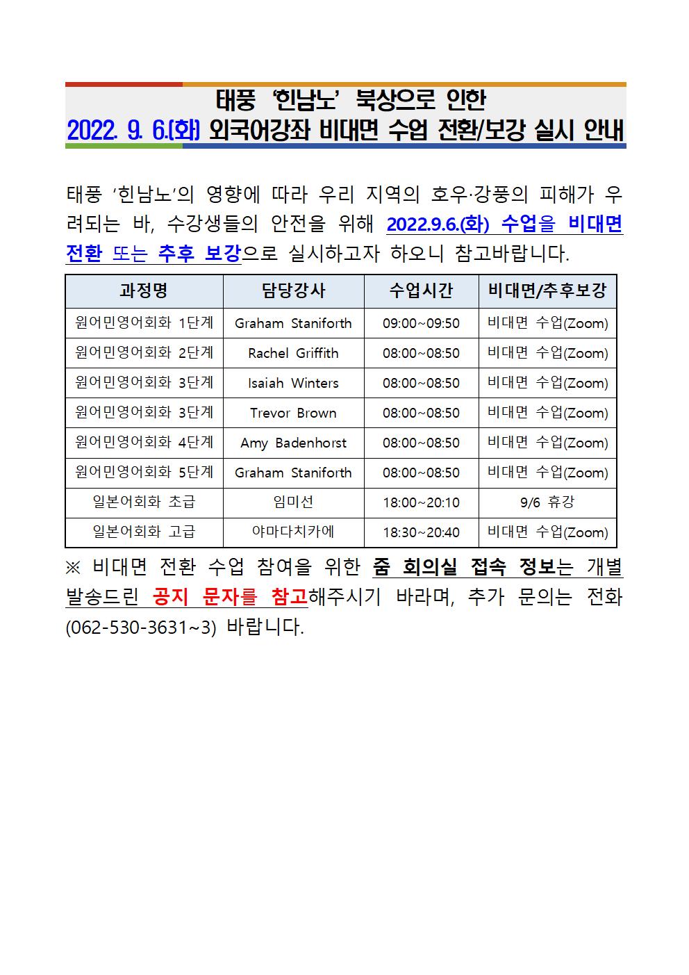 게시판 언어교육원 소개 외국어강좌 한국어강좌 특별강좌 강좌접수 게시판 영어학습센터 공지사항 공지사항 강좌소식 Q & A 특강제안하기 채용공지 영문교정 게시판 공유하기 복사 공지사항 태풍 '힌남노' 북상으로 인한 2022. 9. 6.(화) 외국어강좌 비대면 수업전환 안내 작성자 관리자2(lec) 작성일 2022-09-05 조회 890 첨부파일 #1 20220906비대면전환공지001.jpg[ 다운로드 : 234 ] 171KB . 목록