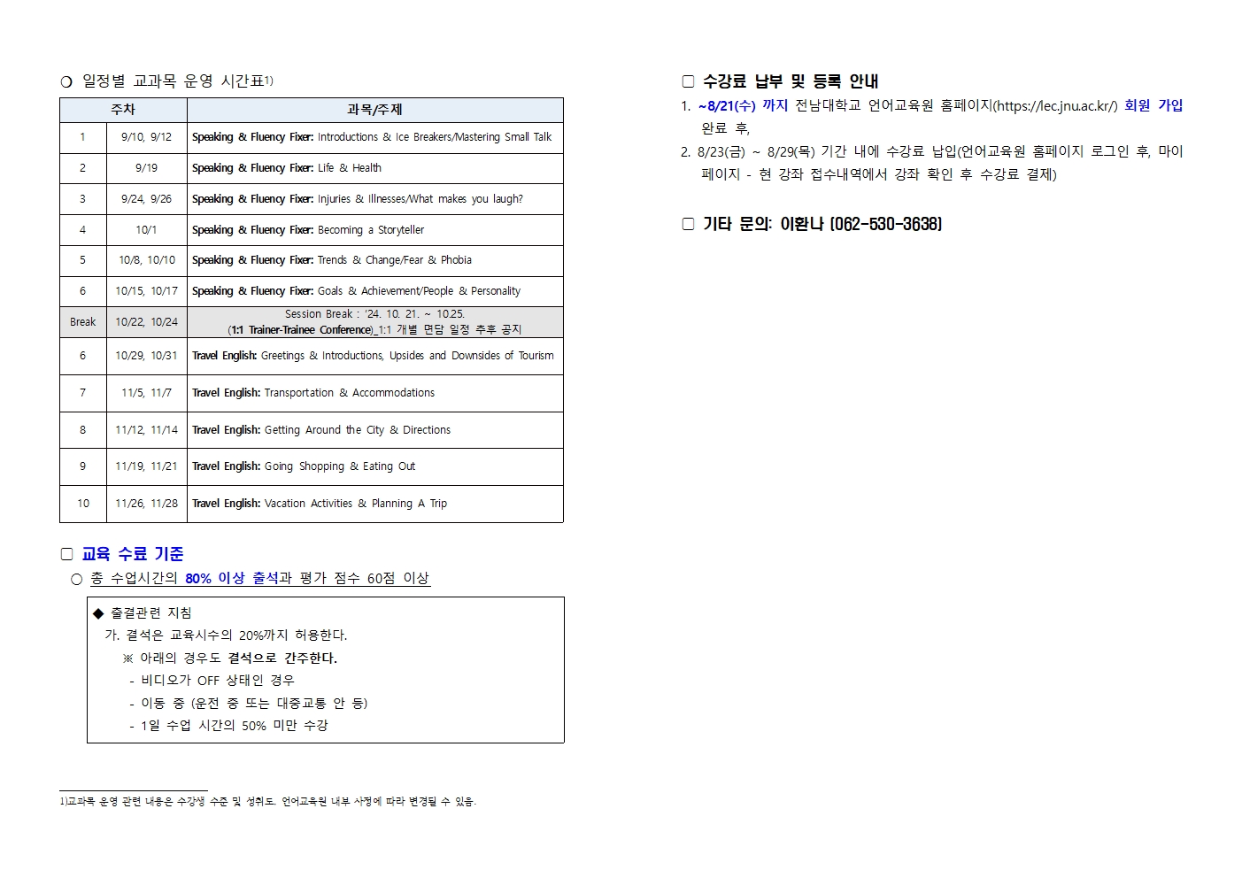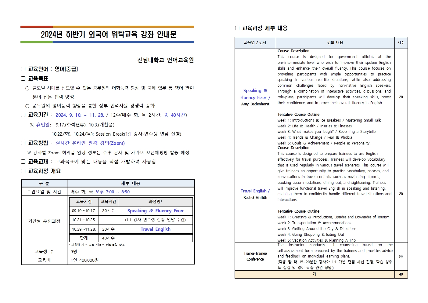 게시판 언어교육원 소개 외국어강좌 한국어강좌 특별강좌 강좌접수 게시판 영어학습센터 공지사항 공지사항 강좌소식 Q & A 특강제안하기 채용공지 영문교정 게시판 공유하기 복사 공지사항 2024년 하반기 인사혁신처 외국어 위탁교육 강좌 안내 및 등록안내 작성자 관리자2(lec) 작성일 2024-08-14 조회 876 첨부파일 #1 2024 하반기 외국어 위탁교육 강좌안내문(전남대)_작업중001.jpg[ 다운로드 : 185 ] 669KB첨부파일 #2 2024 하반기 외국어 위탁교육 강좌안내문(전남대)_작업중002.jpg[ 다운로드 : 173 ] 382KB . 목록