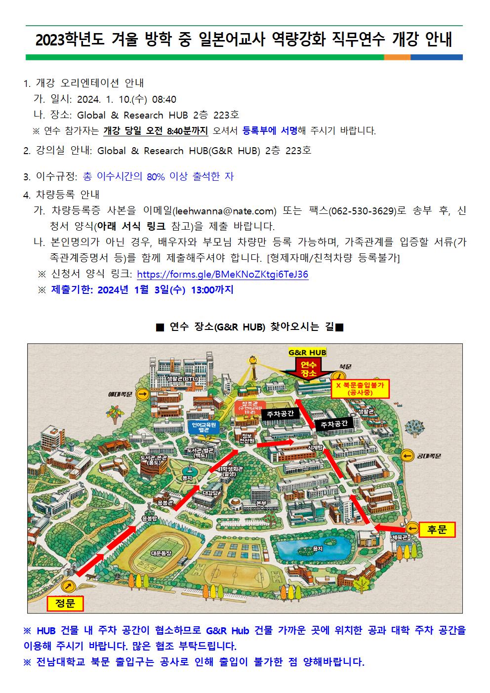 게시판 언어교육원 소개 외국어강좌 한국어강좌 특별강좌 강좌접수 게시판 영어학습센터 공지사항 공지사항 강좌소식 Q & A 특강제안하기 채용공지 영문교정 게시판 공유하기 복사 공지사항 2023학년도 겨울방학 중 일본어교사 역량강화 직무연수 개강안내 작성자 관리자2(lec) 작성일 2023-12-29 조회 1117 첨부파일 #1 일본어교사직무연수 개강안내문001.jpg[ 다운로드 : 214 ] 268KB . 목록