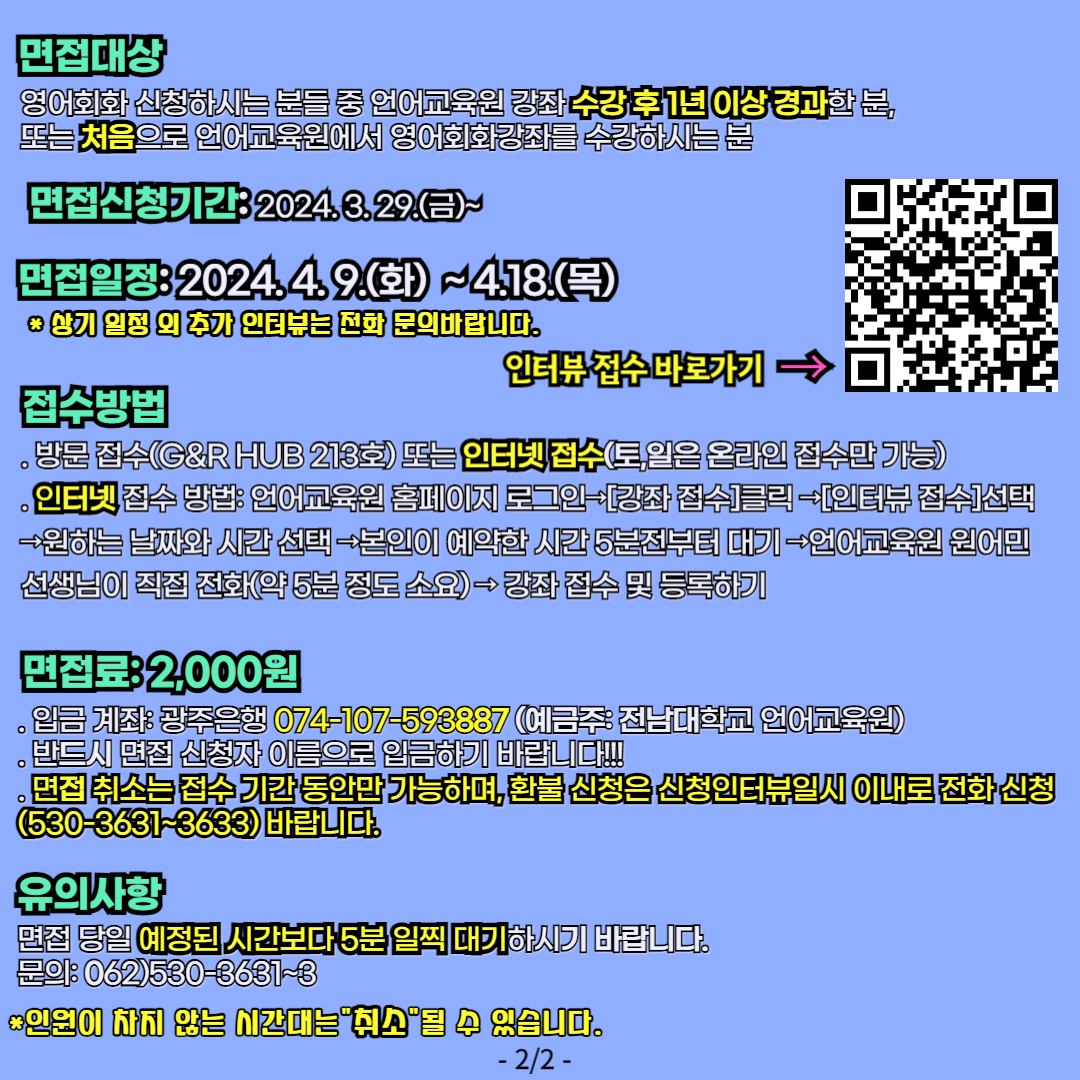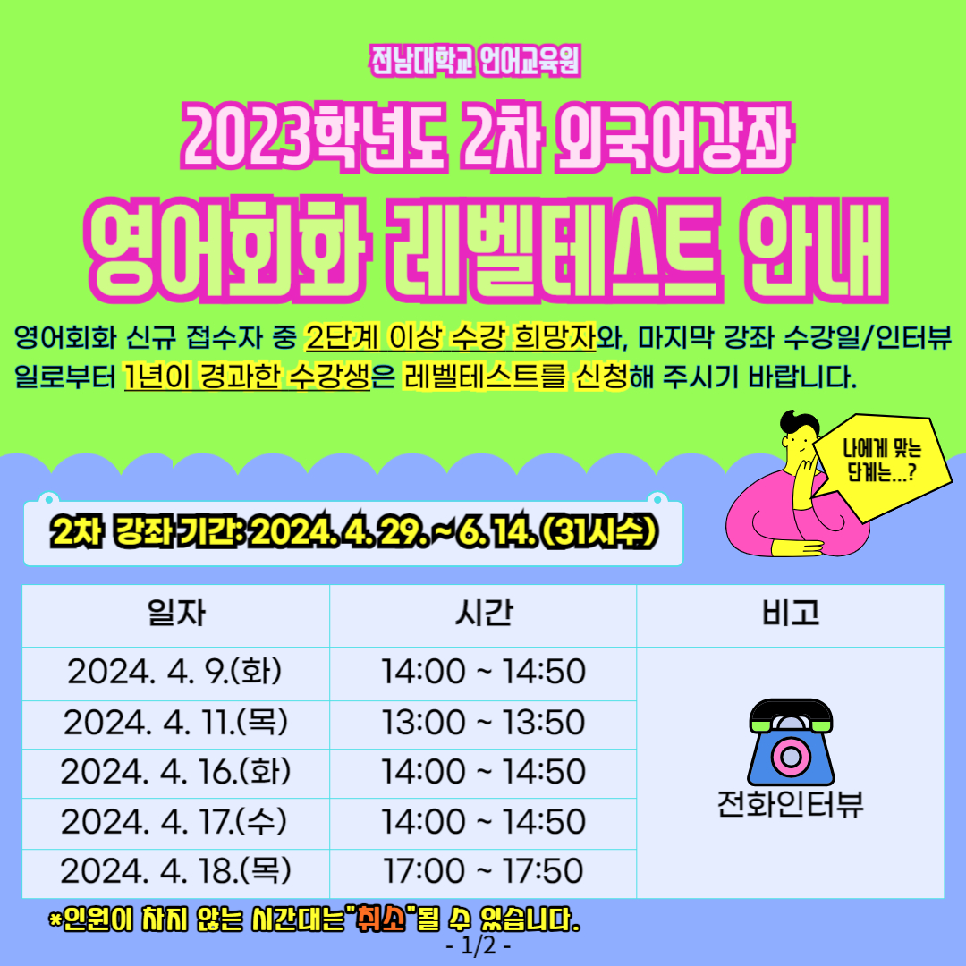 게시판 언어교육원 소개 외국어강좌 한국어강좌 특별강좌 강좌접수 게시판 영어학습센터 공지사항 공지사항 강좌소식 Q & A 특강제안하기 채용공지 영문교정 게시판 공유하기 복사 공지사항 2024학년도 2차 외국어강좌 영어회화 레벨테스트 안내 작성자 관리자2(lec) 작성일 2024-03-29 조회 1520 첨부파일 #1 2024.2차레벨테스트_1.jpg[ 다운로드 : 246 ] 710KB첨부파일 #2 2024.2차레벨테스트_2.jpg[ 다운로드 : 241 ] 896KB . 목록