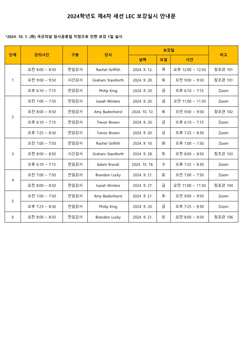 게시판 언어교육원 소개 외국어강좌 한국어강좌 특별강좌 강좌접수 게시판 영어학습센터 공지사항 공지사항 강좌소식 Q & A 특강제안하기 채용공지 영문교정 게시판 공유하기 복사 공지사항 국군의날('24.10.1.) 임시공휴일 지정에 따른 2024. 4차 외국어강좌 보강 일정 안내 작성자 관리자2(lec) 작성일 2024-09-11 조회 801 첨부파일 #1 2024학년도 제4차 외국어강좌 보강 실시 계획표_1.jpg[ 다운로드 : 258 ] 146KB 2024. 4차 외국어강좌 기간 중 국군의 날(2024.10.1.)이 임시공휴일로 지정됨에 따라 다음과 같이 보강을 실시할 예정입니다. 해당 강좌의 보강일정을 참고 바랍니다. 감사합니다. 목록
