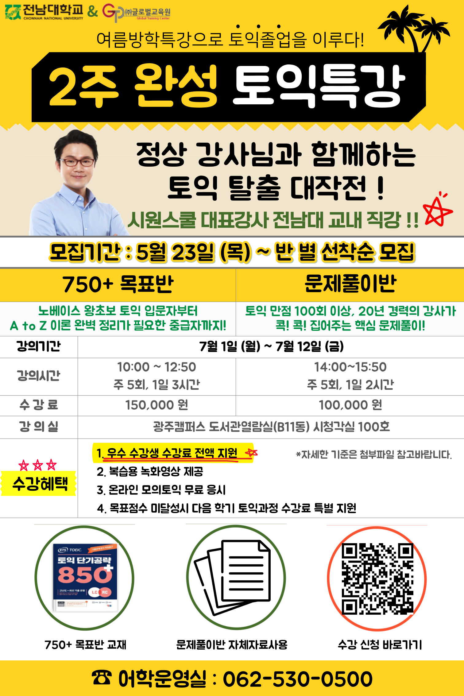 게시판 언어교육원 소개 외국어강좌 한국어강좌 특별강좌 강좌접수 게시판 영어학습센터 공지사항 공지사항 강좌소식 Q & A 특강제안하기 채용공지 영문교정 게시판 공유하기 복사 공지사항 여름방학 2주 단기완성 토익과정 모집안내 작성자 관리자2(lec) 작성일 2024-05-24 조회 2544 첨부파일 #1 2주 완성 토익특강 안내.png[ 다운로드 : 369 ] 766KB첨부파일 #2 2024 여름학기 토익과정.pdf[ 다운로드 : 484 ] 93KB 등록 및 문의 ■ 접수방법 1) 전화접수 : 062.530.0500 2) 온라인 접수 : https://www.gtcprogram.com/m/receipts.php?ig=37 ■ 납부방법 - 무통장 입금 / 광주은행 1107-020-959460 (예금주:전남대학교 언어교육원(토익) *입금시 반드시 “학생 이름”으로 납부 바랍니다. 목록