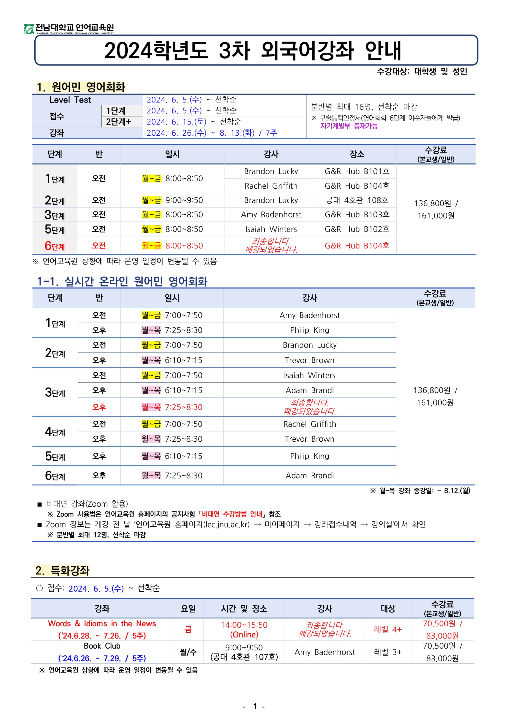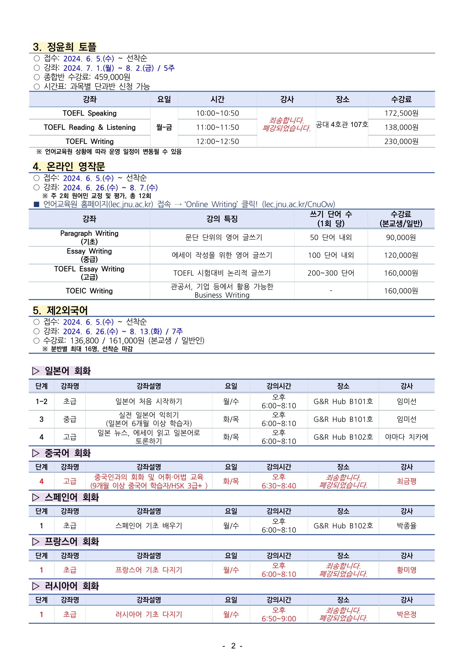 게시판 언어교육원 소개 외국어강좌 한국어강좌 특별강좌 강좌접수 게시판 영어학습센터 공지사항 공지사항 강좌소식 Q & A 특강제안하기 채용공지 영문교정 게시판 공유하기 복사 공지사항 2024학년도 3차 외국어강좌 개폐강 안내 작성자 관리자2(lec) 작성일 2024-06-24 조회 1937 첨부파일 #1 2024 3차 외국어강좌안내_개폐강(1).jpg[ 다운로드 : 176 ] 824KB첨부파일 #2 2024 3차 외국어강좌안내_개폐강(2).jpg[ 다운로드 : 168 ] 876KB첨부파일 #3 2024 3차 외국어강좌안내_개폐강(3).jpg[ 다운로드 : 178 ] 896KB 목록