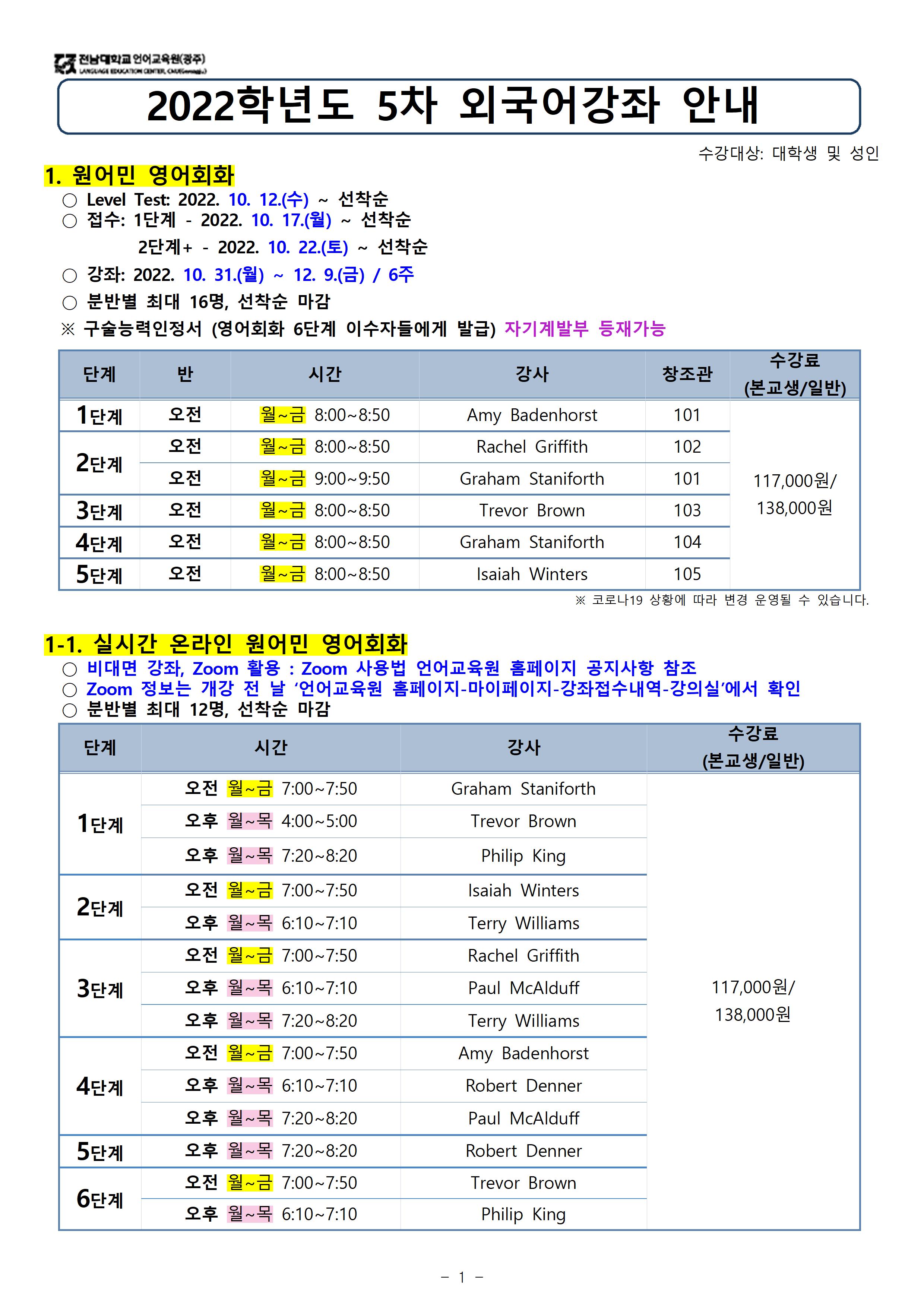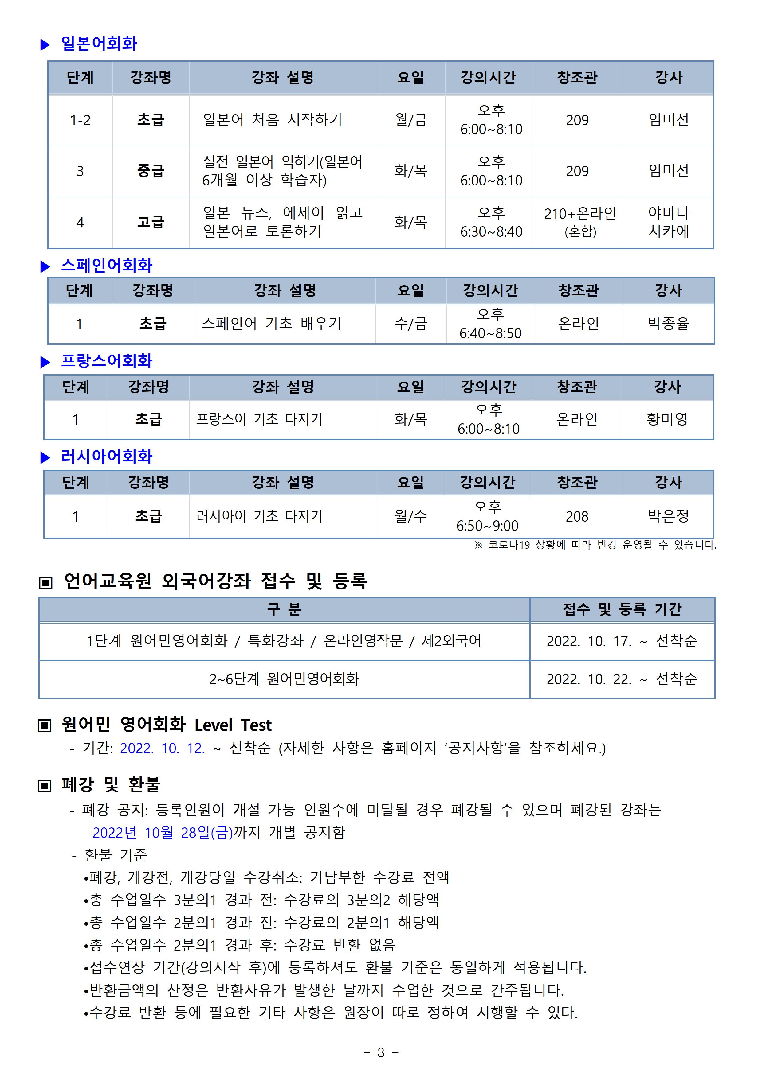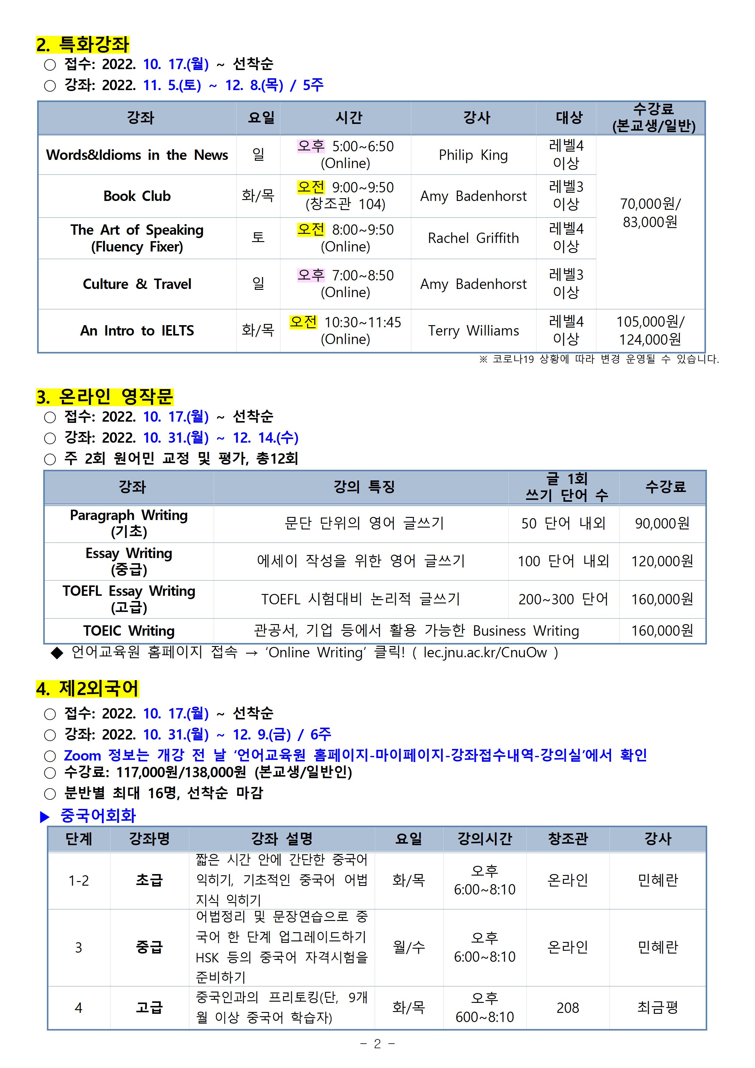 게시판 언어교육원 소개 외국어강좌 한국어강좌 특별강좌 강좌접수 게시판 영어학습센터 공지사항 공지사항 강좌소식 Q & A 특강제안하기 채용공지 영문교정 게시판 공유하기 복사 공지사항 2022학년도 10월(5차) 외국어강좌 안내 작성자 관리자2(lec) 작성일 2022-10-04 조회 2715 첨부파일 #1 image001.jpg[ 다운로드 : 319 ] 770KB첨부파일 #2 image002.jpg[ 다운로드 : 232 ] 764KB첨부파일 #3 image003.jpg[ 다운로드 : 234 ] 716KB첨부파일 #4 image004.jpg[ 다운로드 : 239 ] 730KB (참고) 이미지 클릭시 좀 더 뚜렷하게 내용 확인 가능합니다. 목록