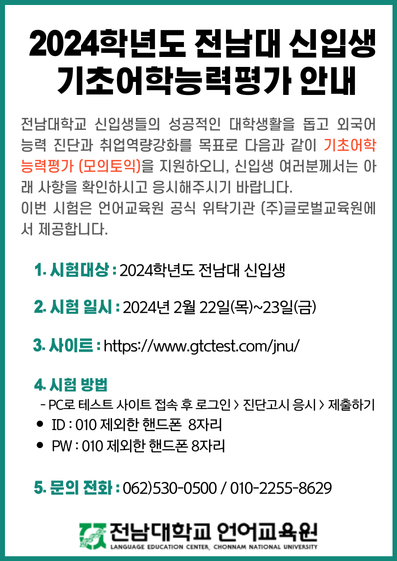 게시판 언어교육원 소개 외국어강좌 한국어강좌 특별강좌 강좌접수 게시판 영어학습센터 공지사항 공지사항 강좌소식 Q & A 특강제안하기 채용공지 영문교정 게시판 공유하기 복사 공지사항 2024학년도 신입생 무료 모의토익 안내 작성자 관리자2(lec) 작성일 2024-02-20 조회 3659 첨부파일 #1 무료토익.png[ 다운로드 : 402 ] 197KB 응시 사이트 : http://www.gtctest.com/jnu/ 목록