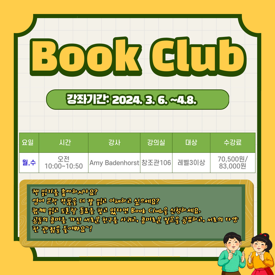 게시판 언어교육원 소개 외국어강좌 한국어강좌 특별강좌 강좌접수 게시판 영어학습센터 강좌소식 공지사항 강좌소식 Q & A 특강제안하기 채용공지 영문교정 게시판 공유하기 복사 강좌소식 [2024학년도 봄학기 특화강좌] Book Club 작성자 관리자2(lec) 작성일 2024-02-24 조회 1119 첨부파일 #1 LEC Book Club Syllabus March, 2024.docx[ 다운로드 : 388 ] 18KB첨부파일 #2 2024_1차-특화강좌-Book Club.jpg[ 다운로드 : 255 ] 290KB . 목록