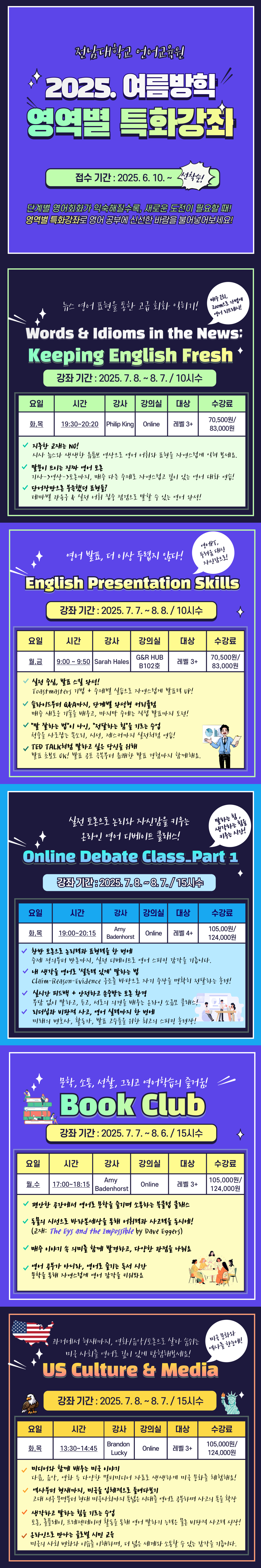 게시판 언어교육원 소개 외국어강좌 한국어강좌 특별강좌 강좌접수 게시판 영어학습센터 강좌소식 공지사항 강좌소식 Q & A 특강제안하기 채용공지 영문교정 게시판 공유하기 복사 강좌소식 [2025학년도 제3차] 외국어강좌 영역별 특화강좌 안내 작성자 관리자2(lec) 작성일 2025-06-10 조회 436 첨부파일 #1 25_-3차-특화강좌_1장.png[ 다운로드 : 121 ] 1MB 자세한 강좌 내용은 각 과정별 강의계획서를 참고해 주세요~ [강의계획서 확인 방법] 1. [강좌접수] - [강좌접수/결제] 페이지로 이동 2. 수강을 원하는 강좌의 ‘신청’ 버튼 클릭 3. 강좌 상세 페이지 내에서 ‘강의계획서 다운로드’ 클릭 목록