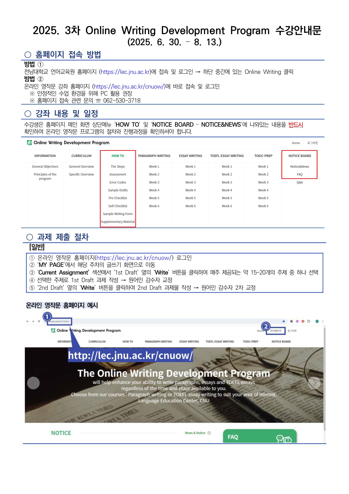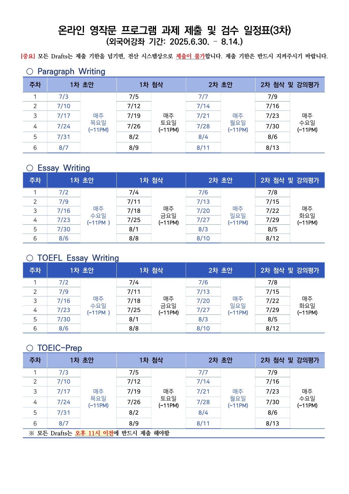 게시판 언어교육원 소개 외국어강좌 한국어강좌 특별강좌 강좌접수 게시판 영어학습센터 강좌소식 공지사항 강좌소식 Q & A 특강제안하기 채용공지 영문교정 게시판 공유하기 복사 강좌소식 [2025학년도 제3차] 외국어강좌 온라인 영작문(Online Writing) 안내 작성자 관리자2(lec) 작성일 2025-06-18 조회 385 첨부파일 #1 2025 온라인 영작문 스케줄 및 안내문_1.jpg[ 다운로드 : 84 ] 403KB첨부파일 #2 2025 온라인 영작문 스케줄 및 안내문_2.jpg[ 다운로드 : 124 ] 429KB첨부파일 #3 2025 온라인 영작문 스케줄 및 안내문_3.jpg[ 다운로드 : 98 ] 271KB [접수방법] ○ 인터넷 접수: 언어교육원 홈페이지(로그인) - [강좌접수] - [강좌 접수/결제] ○ 방문 접수: 언어교육원(G&R Hub 213호) ※ Online Writing 홈페이지 [클릭] 지금 바로 접수하기[클릭] 목록