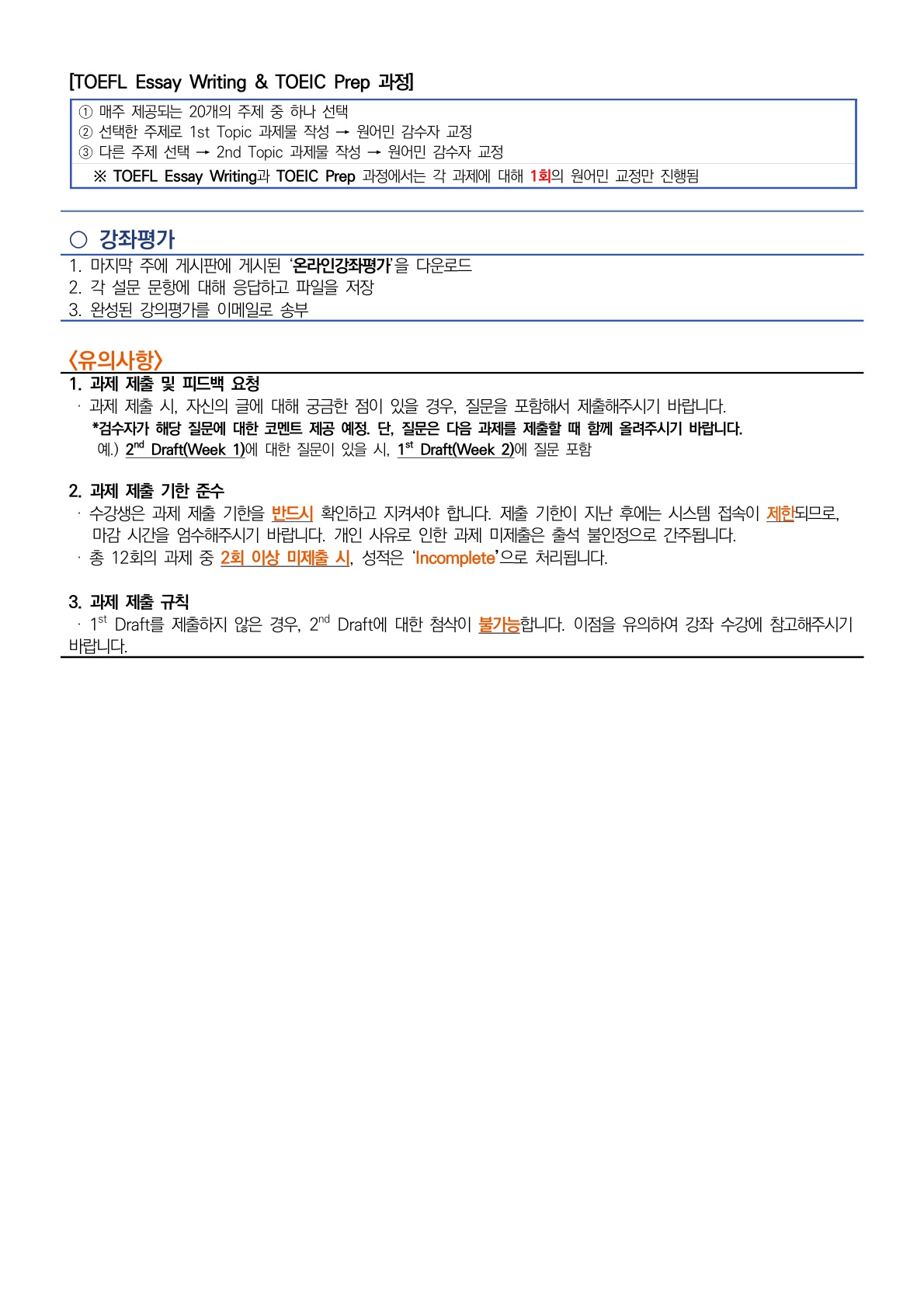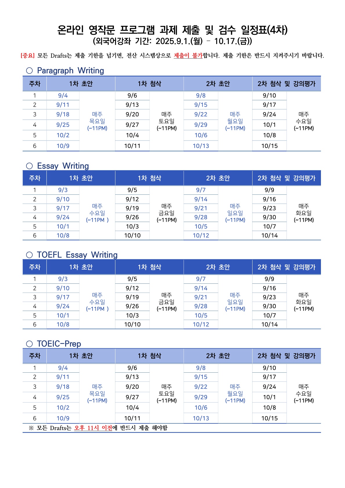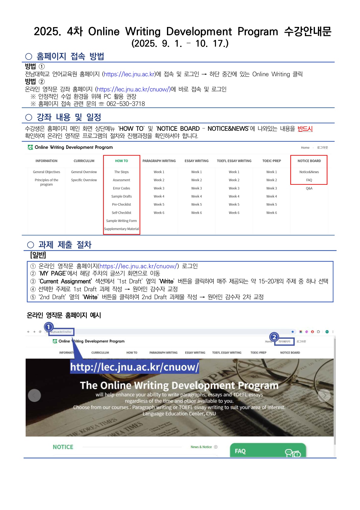 게시판 언어교육원 소개 외국어강좌 한국어강좌 특별강좌 강좌접수 게시판 영어학습센터 강좌소식 공지사항 강좌소식 Q & A 특강제안하기 채용공지 영문교정 게시판 공유하기 복사 강좌소식 [2025학년도 제4차] 외국어강좌 온라인 영작문(Online Writing) 안내 작성자 관리자2(lec) 작성일 2025-08-22 조회 377 첨부파일 #1 2025 온라인 영작문 스케줄(4차)_1.jpg[ 다운로드 : 74 ] 412KB첨부파일 #2 안내문_RENEW_1.jpg[ 다운로드 : 74 ] 427KB첨부파일 #3 안내문_RENEW_2.jpg[ 다운로드 : 69 ] 269KB [접수방법] ○ 인터넷 접수: 언어교육원 홈페이지(로그인) - [강좌접수] - [강좌 접수/결제] ○ 방문 접수: 언어교육원(G&R Hub 213호) 지금 바로 접수하기[클릭] 목록