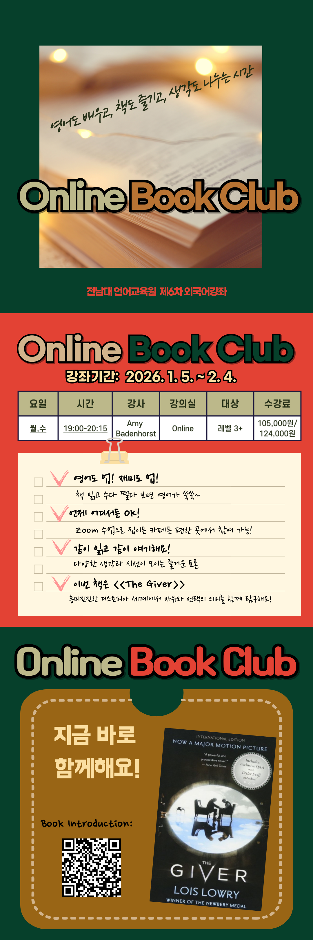 게시판 언어교육원 소개 외국어강좌 한국어강좌 특별강좌 강좌접수 게시판 영어학습센터 강좌소식 공지사항 강좌소식 Q & A 특강제안하기 채용공지 영문교정 게시판 공유하기 복사 강좌소식 [2025학년도 6차_영역별 특화강좌] Online Book Club 작성자 관리자2(lec) 작성일 2025-12-03 조회 41 첨부파일 #1 Book-Club_S6.png[ 다운로드 : 6 ] 1MB첨부파일 #2 LEC Online Book Club Syllabus 2026 The Giver.docx[ 다운로드 : 17 ] 22KB . 목록