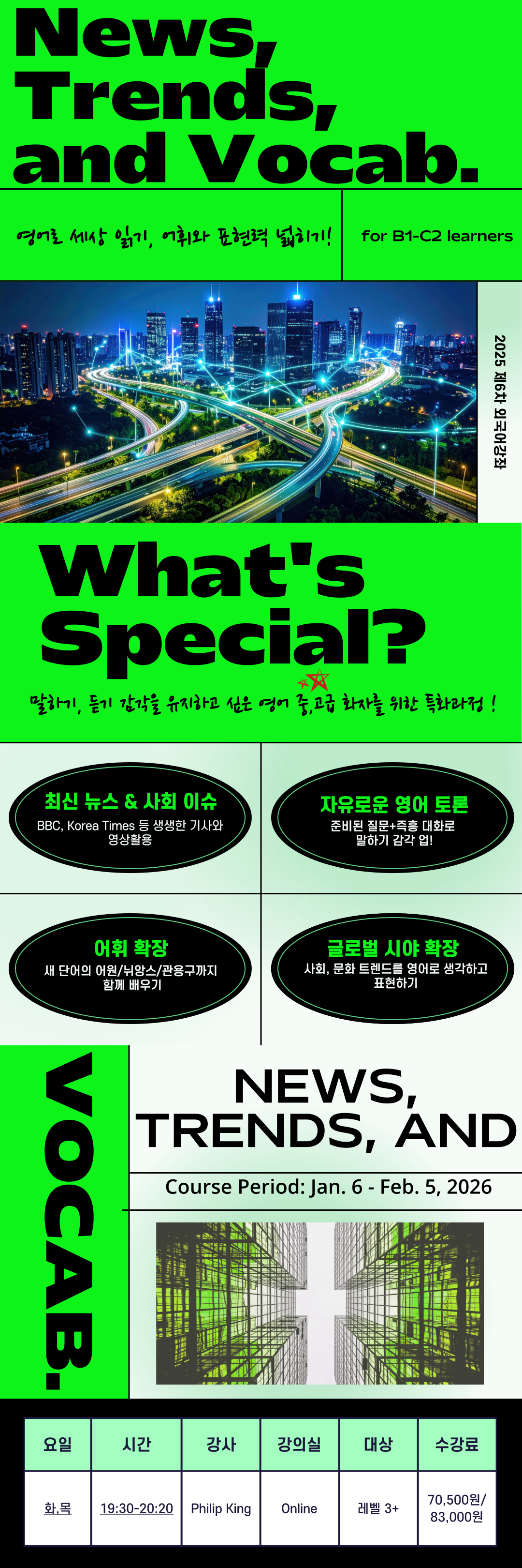 게시판 언어교육원 소개 외국어강좌 한국어강좌 특별강좌 강좌접수 게시판 영어학습센터 강좌소식 공지사항 강좌소식 Q & A 특강제안하기 채용공지 영문교정 게시판 공유하기 복사 강좌소식 [2025학년도 6차_영역별 특화강좌] News, Trends, and Vocab. 작성자 관리자2(lec) 작성일 2025-12-03 조회 38 첨부파일 #1 News_-Trends_-and-Vocab__2025_-6차.png[ 다운로드 : 6 ] 1MB . 목록