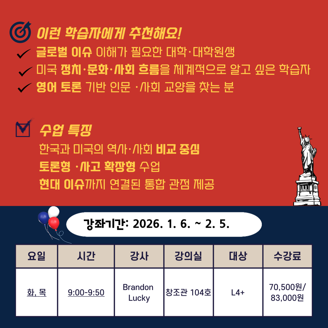 게시판 언어교육원 소개 외국어강좌 한국어강좌 특별강좌 강좌접수 게시판 영어학습센터 강좌소식 공지사항 강좌소식 Q & A 특강제안하기 채용공지 영문교정 게시판 공유하기 복사 강좌소식 [2025학년도 6차_영역별 특화강좌] US Culture & Society 작성자 관리자2(lec) 작성일 2025-12-05 조회 152 첨부파일 #1 001.png[ 다운로드 : 32 ] 470KB첨부파일 #2 002.png[ 다운로드 : 23 ] 167KB . 목록