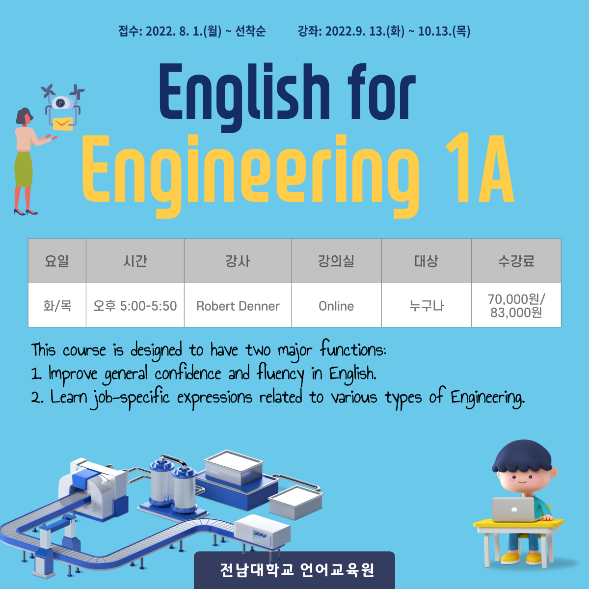 게시판 언어교육원 소개 외국어강좌 한국어강좌 특별강좌 강좌접수 게시판 영어학습센터 강좌소식 공지사항 강좌소식 Q & A 특강제안하기 채용공지 영문교정 게시판 공유하기 복사 강좌소식 2022학년도 3차 특화강좌 English for Engineering 1A 작성자 관리자2(lec) 작성일 2022-08-11 조회 1286 첨부파일 #1 English for Engineering 1A.png[ 다운로드 : 338 ] 357KB * 강좌 세부내용은 [강좌 접수]- 강의계획서를 참고하세요~! 목록