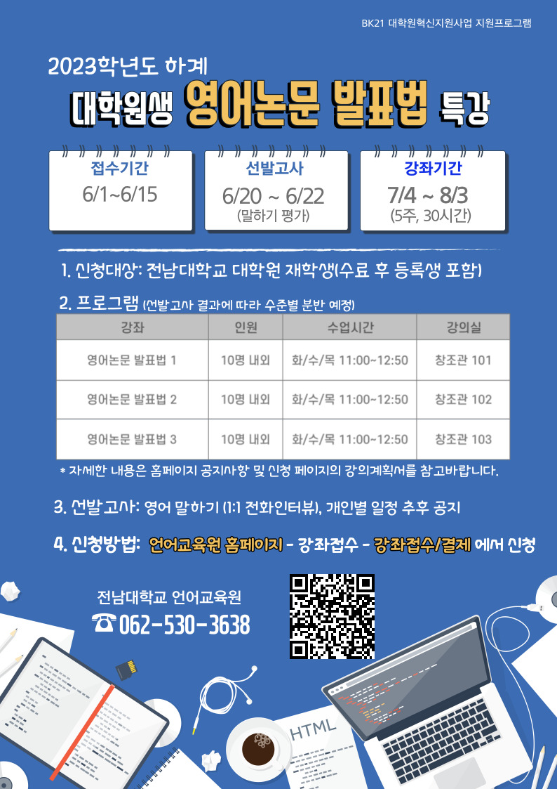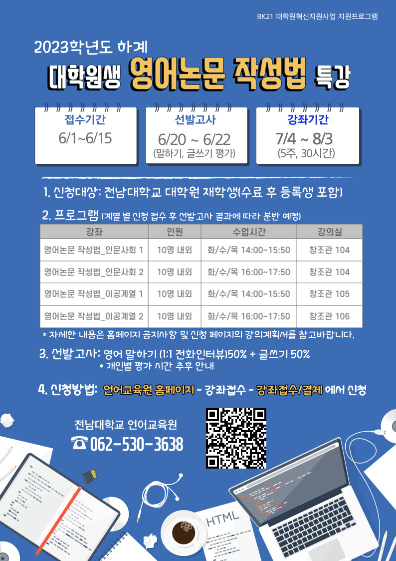게시판 언어교육원 소개 외국어강좌 한국어강좌 특별강좌 강좌접수 게시판 영어학습센터 강좌소식 공지사항 강좌소식 Q & A 특강제안하기 채용공지 영문교정 게시판 공유하기 복사 강좌소식 [CNU 대학원생 대상 무료강좌] 대학원생 영어논문 작성/발표법 특강 작성자 관리자2(lec) 작성일 2023-06-01 조회 1072 첨부파일 #1 논문작성법 특강.jpg[ 다운로드 : 366 ] 282KB첨부파일 #2 논문발표법 특강.jpg[ 다운로드 : 323 ] 270KB . 목록