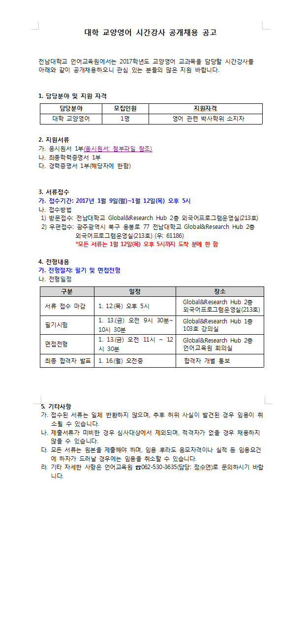 게시판 언어교육원 소개 외국어강좌 한국어강좌 특별강좌 강좌접수 게시판 영어학습센터 채용공지 공지사항 강좌소식 Q & A 특강제안하기 채용공지 영문교정 게시판 공유하기 복사 채용공지 2017학년도 대학 교양영어 시간강사 공개채용공고(1.9~1.12) 작성자 관리자2(lec) 작성일 2017-01-09 조회 1796 첨부파일 #1 교양시간강사채용.png[ 다운로드 : 476 ] 41KB첨부파일 #2 2017학년도 교양 영어 시간강사 초빙 공고문.hwp[ 다운로드 : 639 ] 15KB첨부파일 #3 응시원서.hwp[ 다운로드 : 599 ] 16KB 목록