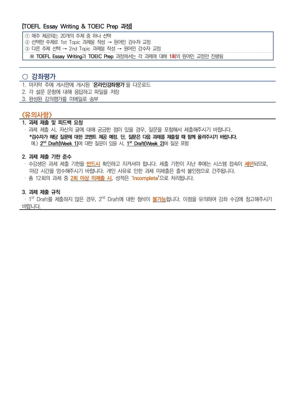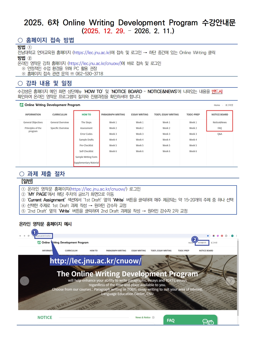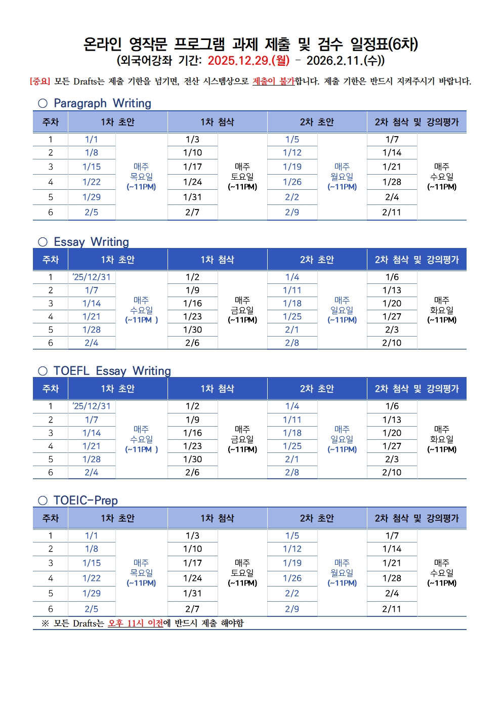NOTICE BOARD INFORMATION CURRICULUM HOW TO PARAGRAPH WRITING ESSAY WRITING TOEFL ESSAY WRITING TOEIC-PREP NOTICE BOARD Notice&News Notice&News FAQ Q&A NOTICE BOARD 공유하기 복사 Notice&News 2025년 6차 온라인영작문 안내문&스케줄 안내 작성자 관리자2(lec) 작성일 2025-12-04 조회 410 첨부파일 #1 image1.jpg[ 다운로드 : 62 ] 528KB첨부파일 #2 image2001.jpg[ 다운로드 : 33 ] 596KB첨부파일 #3 image2002.jpg[ 다운로드 : 30 ] 369KB [접수방법] ○ 인터넷 접수: 언어교육원 홈페이지(로그인) - [강좌접수] - [강좌 접수/결제] ○ 방문 접수: 언어교육원(G&R Hub 213호) 지금 바로 접수하기[클릭] 목록