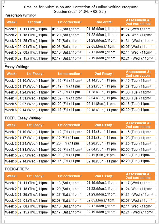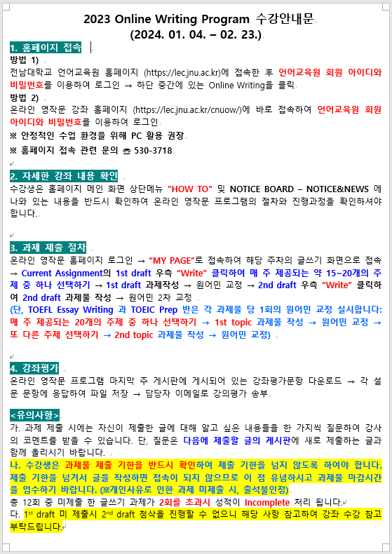 NOTICE BOARD INFORMATION CURRICULUM HOW TO PARAGRAPH WRITING ESSAY WRITING NOTICE BOARD Notice&News Notice&News FAQ Q&A NOTICE BOARD 공유하기 복사 Notice&News 2023년 6차 온라인강좌 수강 안내문&스케줄 안내 작성자 관리자2(lec) 작성일 2023-11-28 조회 652 첨부파일 #1 2023.06 수강안내문.png[ 다운로드 : 215 ] 74KB첨부파일 #2 2023.06 시간표.png[ 다운로드 : 234 ] 81KB 목록