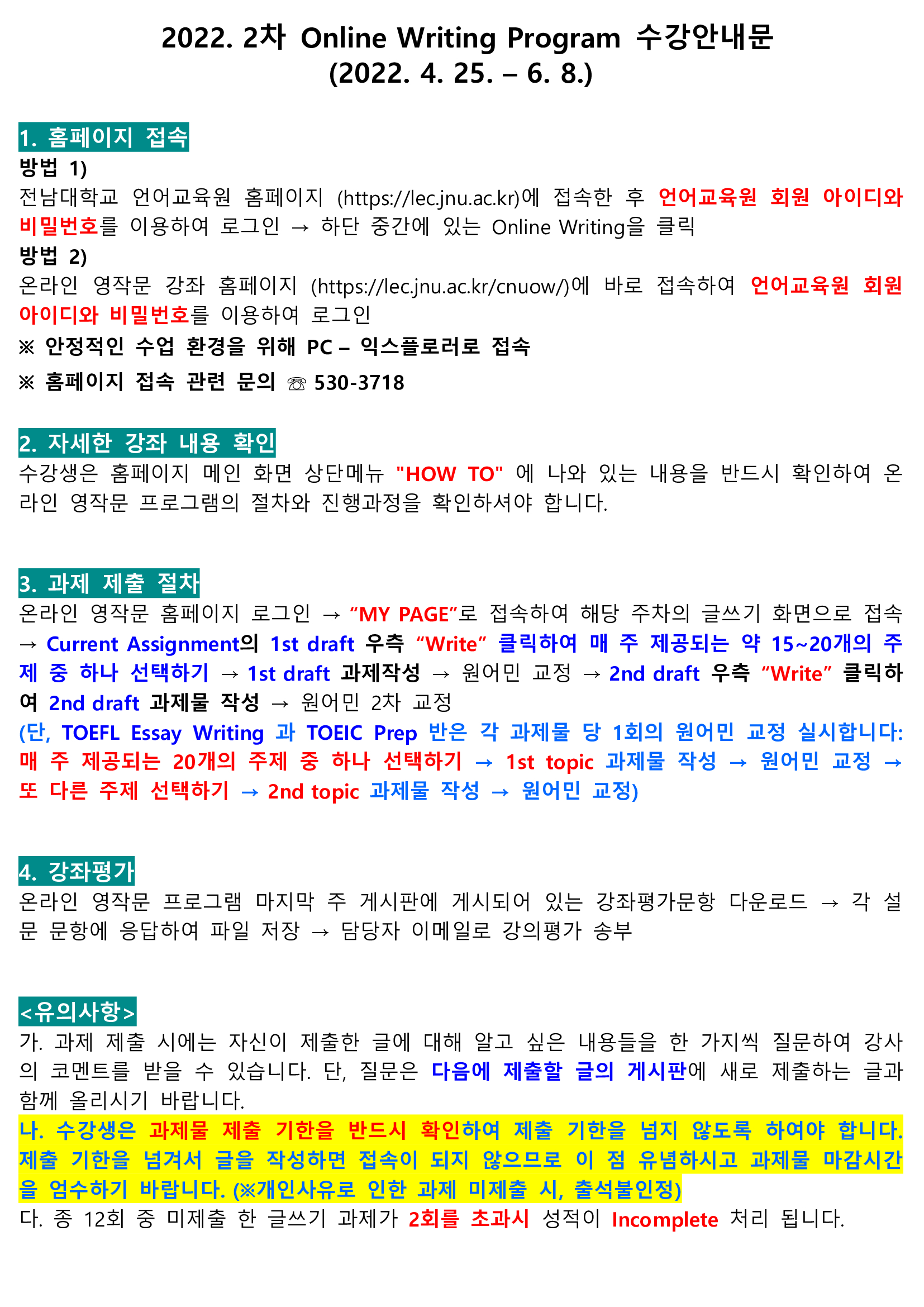 NOTICE BOARD INFORMATION CURRICULUM HOW TO PARAGRAPH WRITING ESSAY WRITING NOTICE BOARD Notice&News Notice&News FAQ Q&A NOTICE BOARD 공유하기 복사 Notice&News 2022년 2차(2022년 4월~6월) 온라인강좌 수강 안내문 & 스케줄 안내 작성자 관리자2(lec) 작성일 2022-04-04 조회 1042 첨부파일 #1 안내.jpg[ 다운로드 : 260 ] 1MB첨부파일 #2 스케줄.jpg[ 다운로드 : 276 ] 1MB 목록