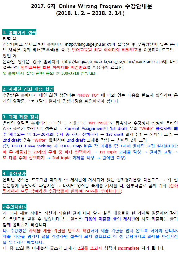 NOTICE BOARD INFORMATION CURRICULUM HOW TO PARAGRAPH WRITING ESSAY WRITING NOTICE BOARD Notice&News Notice&News FAQ Q&A NOTICE BOARD 공유하기 복사 Notice&News 2017년6차(1월-2월) 온라인강좌 수강 안내문 & 스케쥴파일 작성자 관리자2(lec) 작성일 2017-12-29 조회 813 첨부파일 #1 2.png[ 다운로드 : 286 ] 78KB첨부파일 #2 1.png[ 다운로드 : 287 ] 98KB 강좌안내 목록